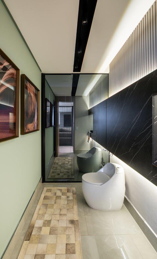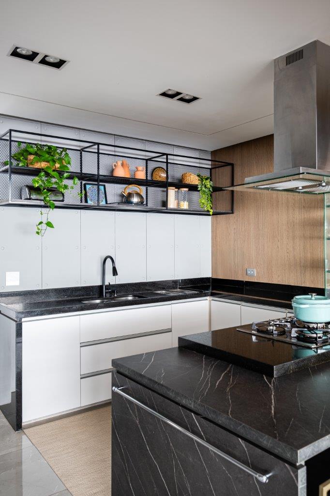 Além da estética, a reforma modernizou a infraestrutura elétrica e de iluminação, e instalou ar-condicionado. O piso cinza polido, escolhido pelos moradores, foi aplicado em grandes placas, reforçando a sensação de continuidade e sofisticação. A paleta de cores neutras, com toques de preto e a beleza da pedra portuguesa, ganha vida com pontos estratégicos de cor, refletindo o estilo jovem e elegante do casal.