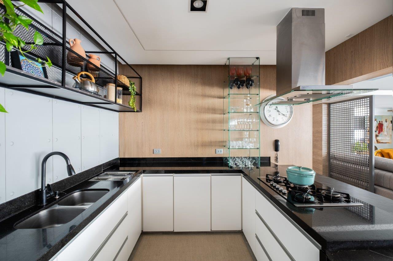 O coração da transformação foi a integração da área social. A planta original, com três dormitórios, deu lugar a um amplo living multifuncional que conecta sala de estar, jantar, home office e um charmoso cantinho do café. A cozinha, já aberta, manteve sua integração, otimizando a convivência e a entrada de luz natural.