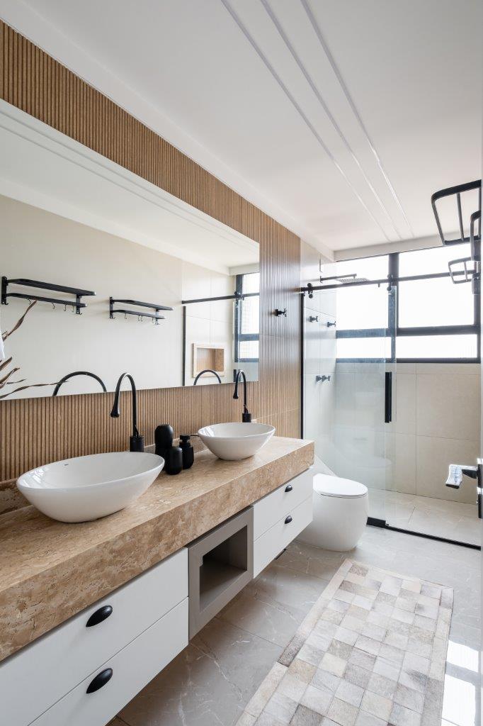 Outra intervenção inteligente foi a criação de um novo lavabo a partir do segundo banheiro. A arquiteta projetou um ambiente intimista, onde a área de banho foi habilmente oculta por um painel espelhado, que também contribuiu para a sensação de amplitude.