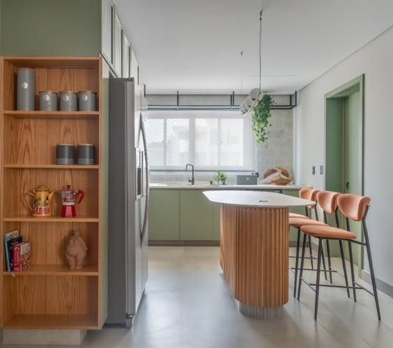 Em cozinhas pequenas e lineares, a arquiteta aposta em portas ripadas de madeira, que restringem o acesso visual sem bloquear a ventilação. Já em projetos mais abertos, o uso do vidro canelado nas esquadrias garante privacidade em relação à área social, criando uma composição leve e contemporânea. Em outro projeto, Mari repetiu o tom verde menta da marcenaria da cozinha na porta de madeira que separa a área de serviço, reforçando a unidade visual do espaço.