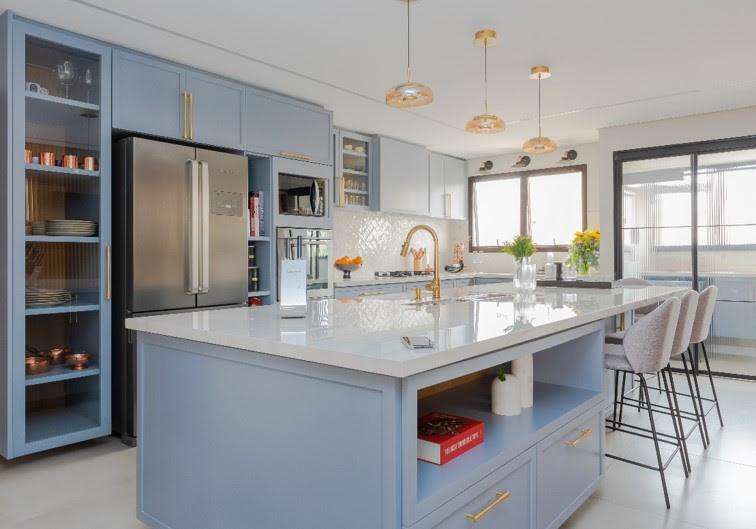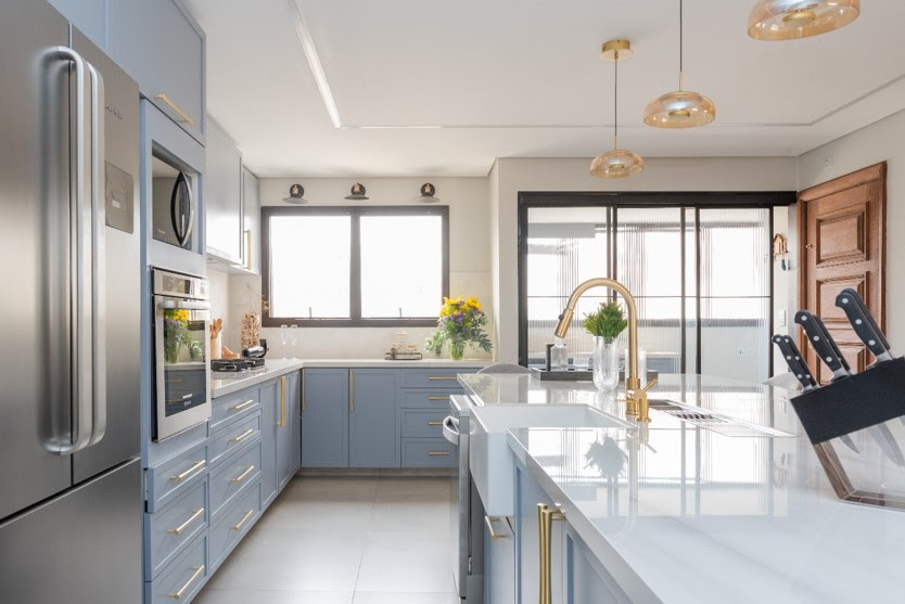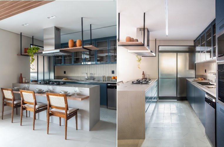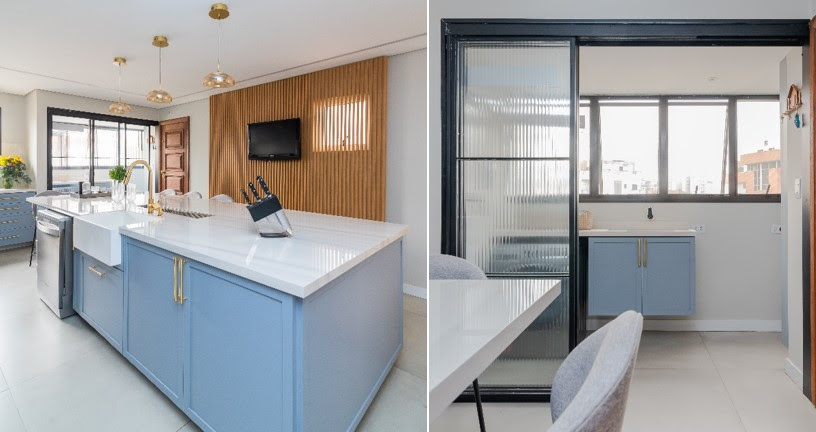 Um bom exemplo dessa solução aparece em um apartamento assinado pela arquiteta, onde a cozinha ampla com ilha central e marcenaria em azul claro se conecta à lavanderia por meio de uma porta de serralheria com vidro canelado. O fechamento garante discrição, sem comprometer a iluminação natural, potencializada pela janela próxima à bancada. O resultado é um ambiente fluido, iluminado e elegante, com cada espaço cumprindo seu papel.