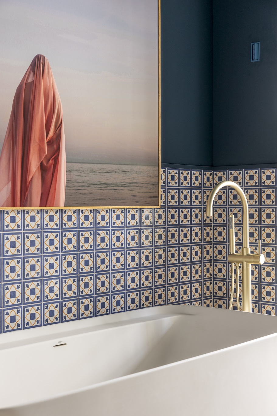 • Banheiro: Coleção Italian Days da Ceusa, com lançamentos que harmonizam o azul intenso com o amarelo queimado, transmitindo um clima alegre e despojado.