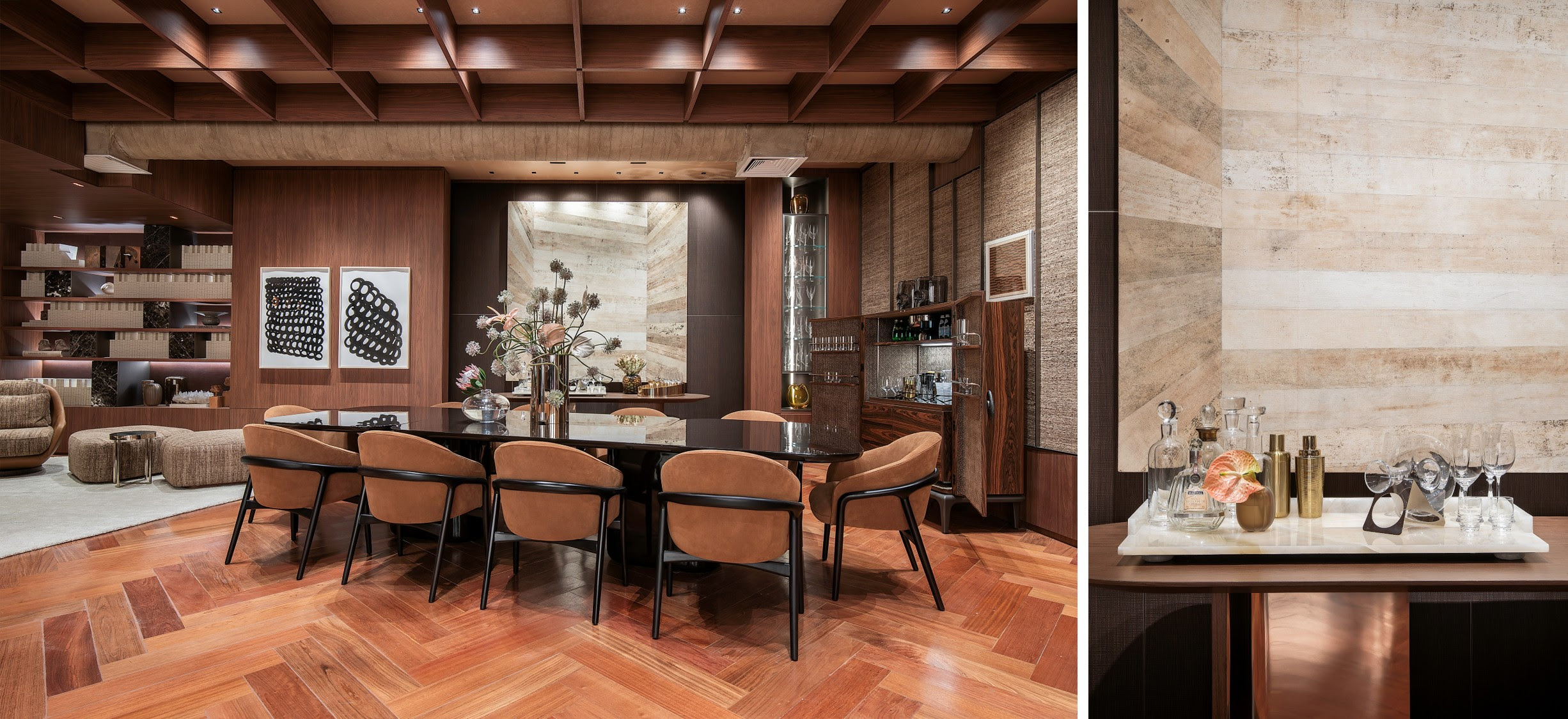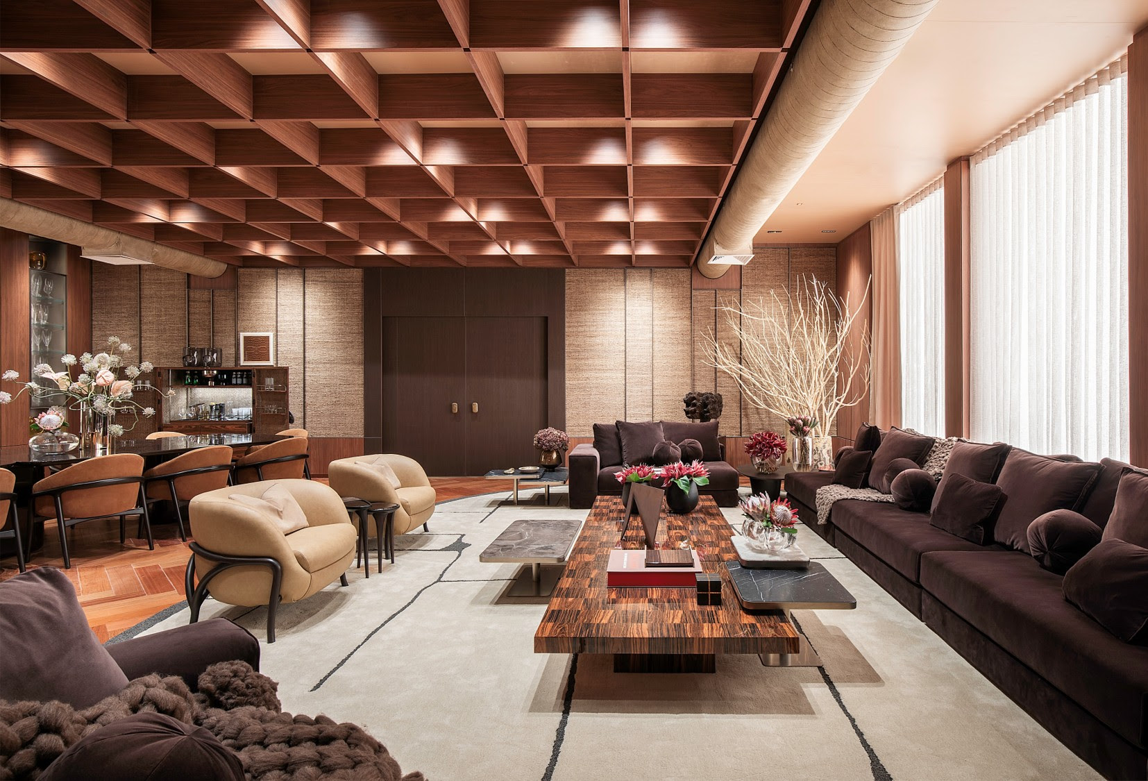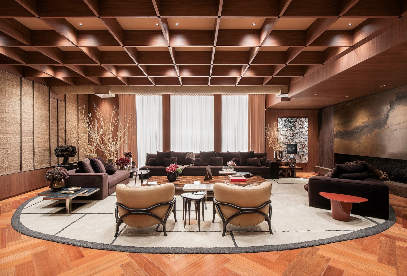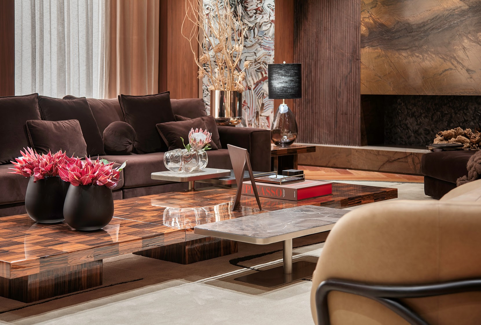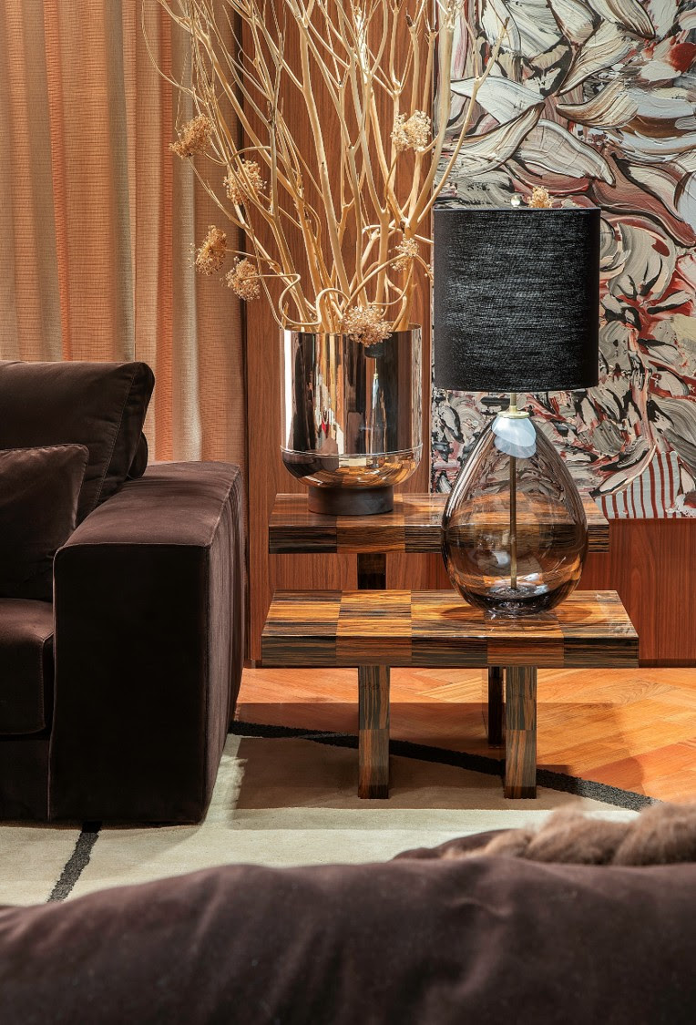 A base estética do living aposta em cerca de 30 tonalidades de marrom, aplicadas em diferentes materiais como madeira, couro, camurça, veludo e mármores brasileiros e italianos. Entre os destaques estão as pedras naturais Mármore Nero Marquina, Mármore Marrom Imperador e o quartzito Quartzito Chivas, utilizado na lareira.