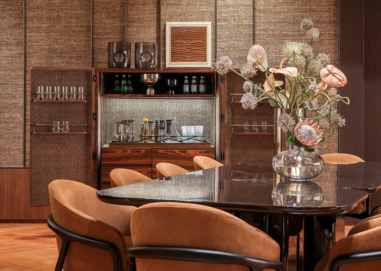 A madeira também assume papel protagonista. Painéis com boiserie em madeira Canela, assoalho de cumaru e marcenaria sob medida reforçam a sensação de permanência e elegância. Já a presença de seda natural tecida em tear artesanal, aplicada nas paredes, acrescenta sofisticação e evidencia o valor do trabalho manual.