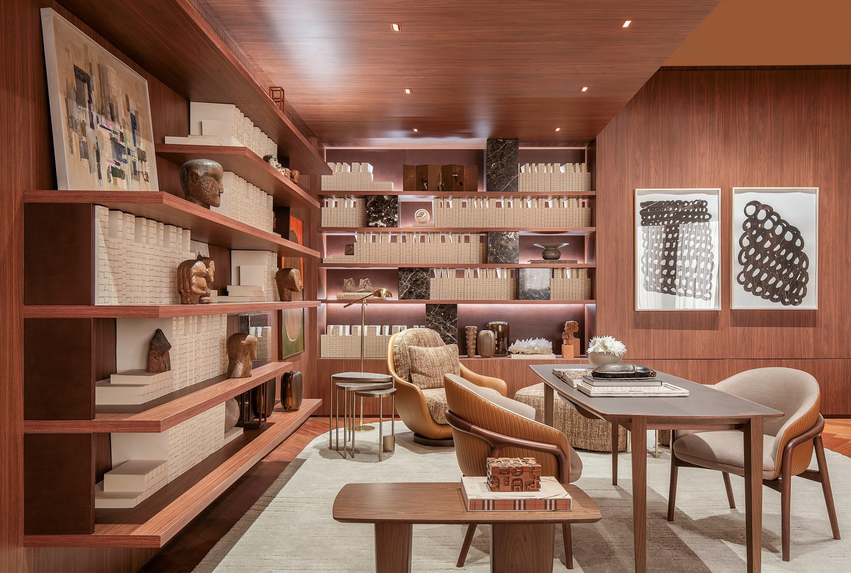 Com lareira, sala de jantar e biblioteca integradas, o projeto propõe um ambiente que vai além da estética: ele convida à convivência, à introspecção e à contemplação. Entre tons profundos de marrom, texturas naturais e iluminação cuidadosamente desenhada, o espaço revela uma atmosfera de conforto e atemporalidade — valores que marcam tanto a carreira da arquiteta quanto a identidade da marca.