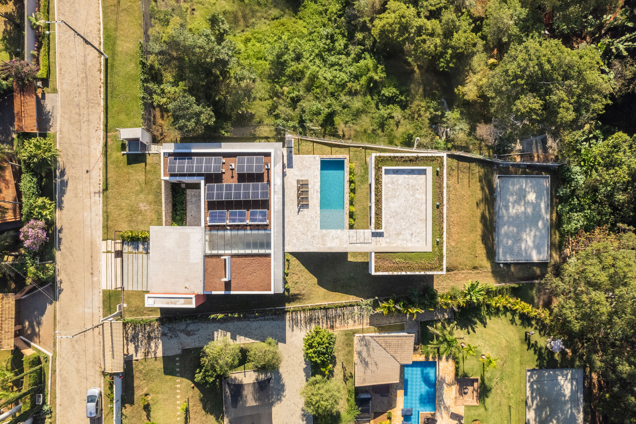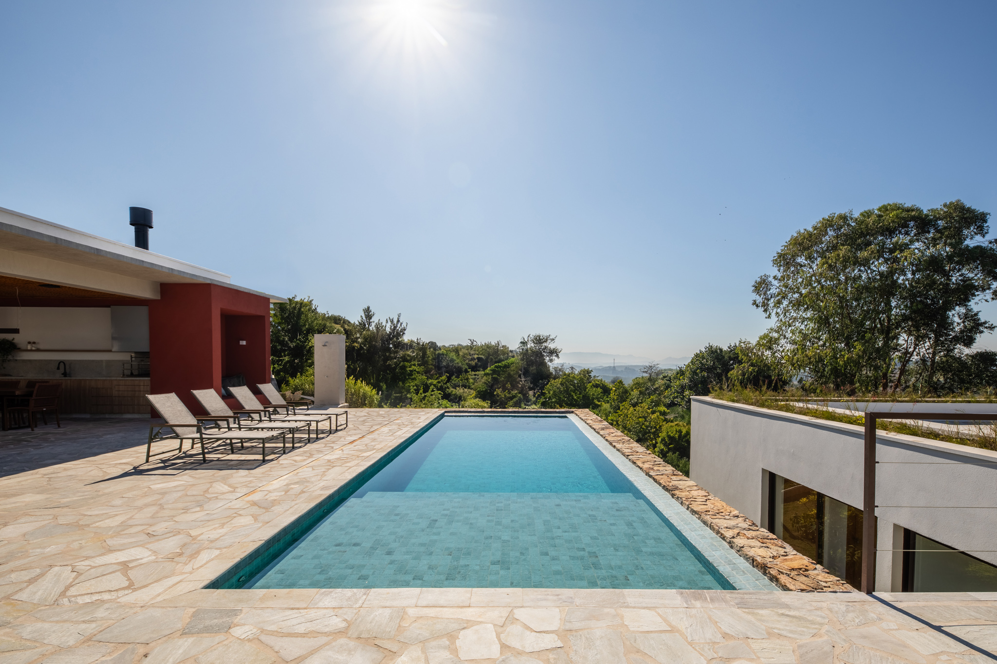 A casa respeita as variações de nível do terreno de forma orgânica, criando uma integração perfeita entre os espaços internos e externos. A área social, com suas divisões transparentes, permite que a varanda e a piscina se integrem ao ambiente, criando o cenário perfeito para momentos de lazer. A ventilação cruzada e a abundante luz natural são valorizadas ao máximo, proporcionando uma atmosfera leve e agradável.