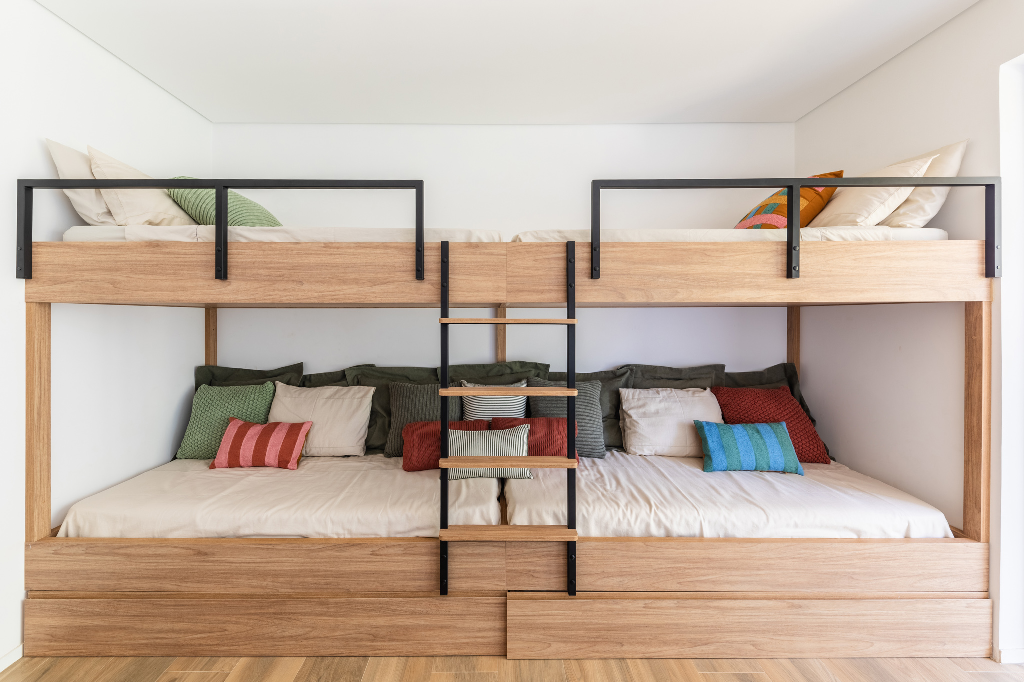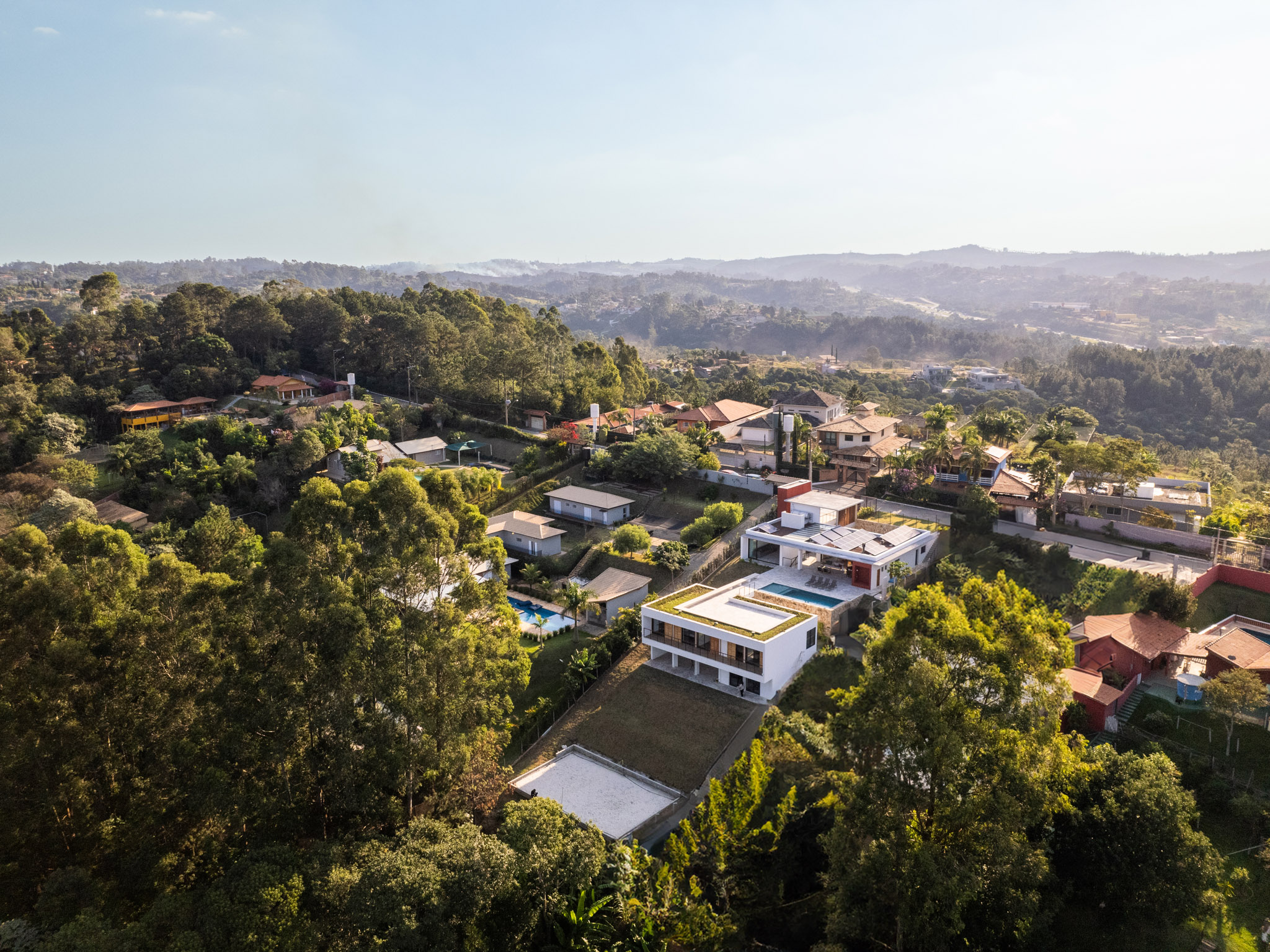 No nível inferior, a casa abriga cinco suítes, incluindo a suíte master com home office e uma suíte infantil, com beliches e amplo espaço para brincadeiras. A escolha de materiais simples e aconchegantes, como madeira e palhinha, proporciona um ambiente acolhedor e confortável. Além disso, o terreno com declive permitiu a criação de um salão de jogos e um estúdio de música, atendendo a uma das grandes paixões da família. A quadra de areia, localizada próximo à mata preservada, é o lugar ideal para a prática de esportes ao ar livre, permitindo ainda mais a integração com a natureza.