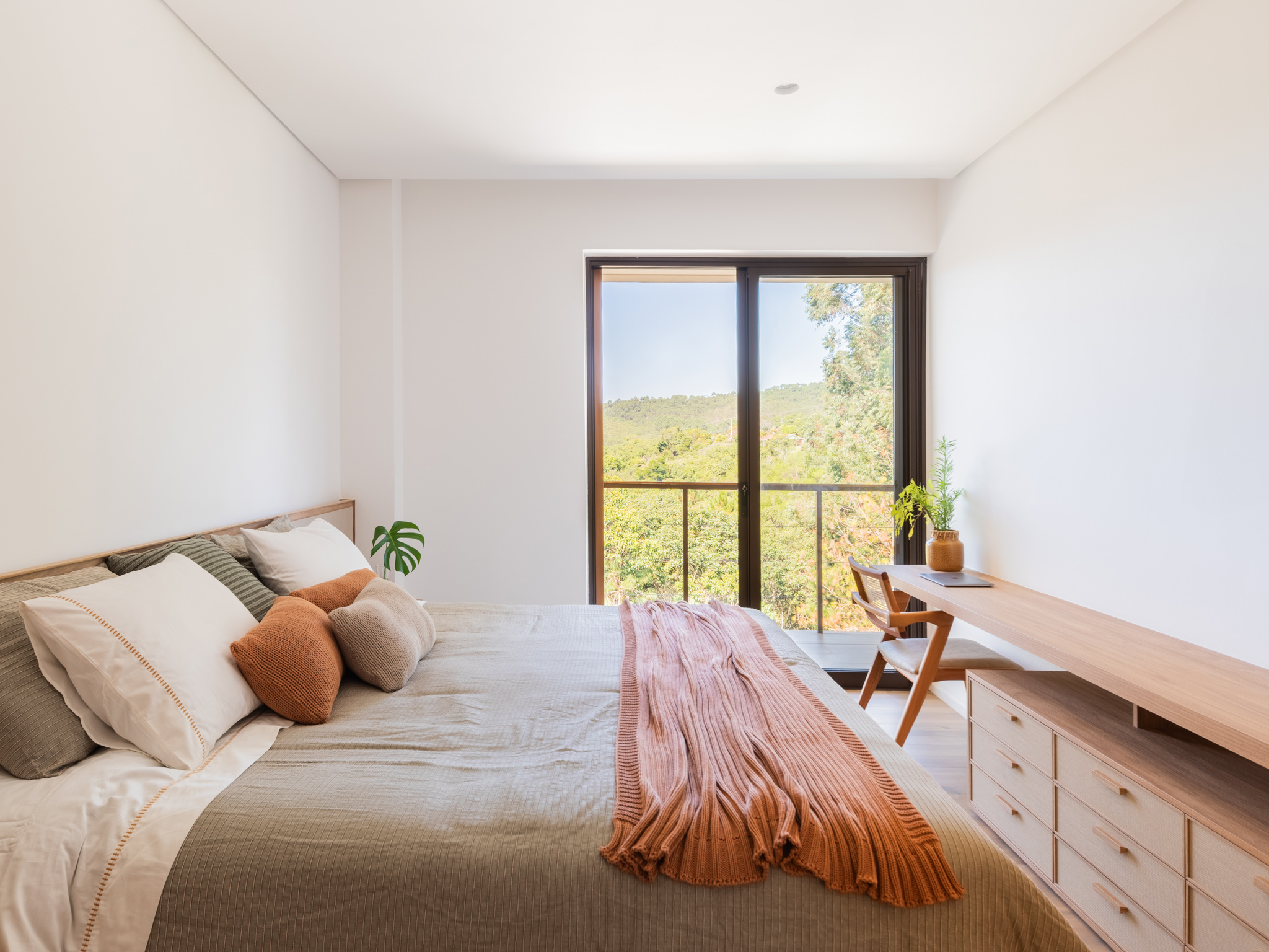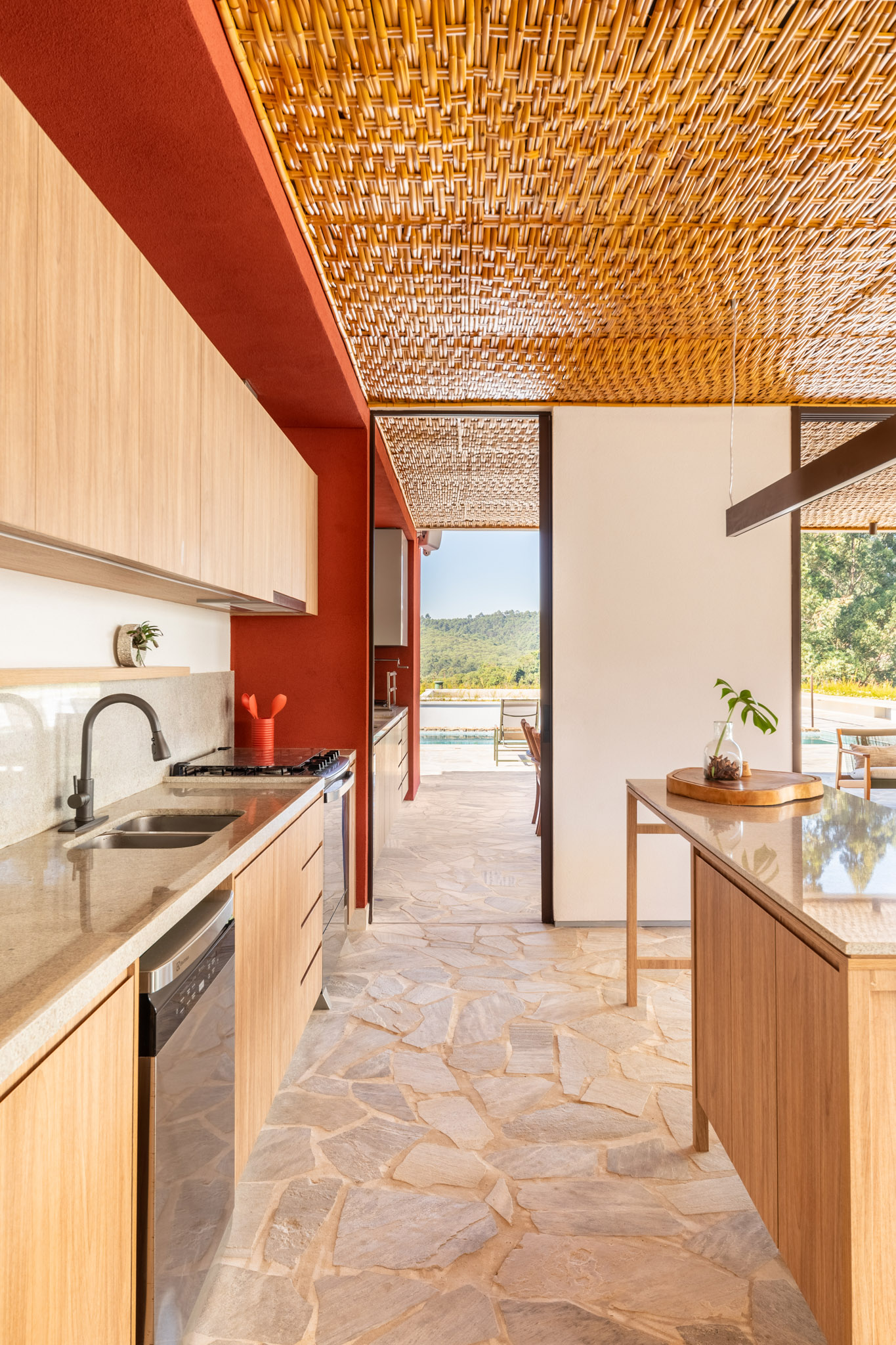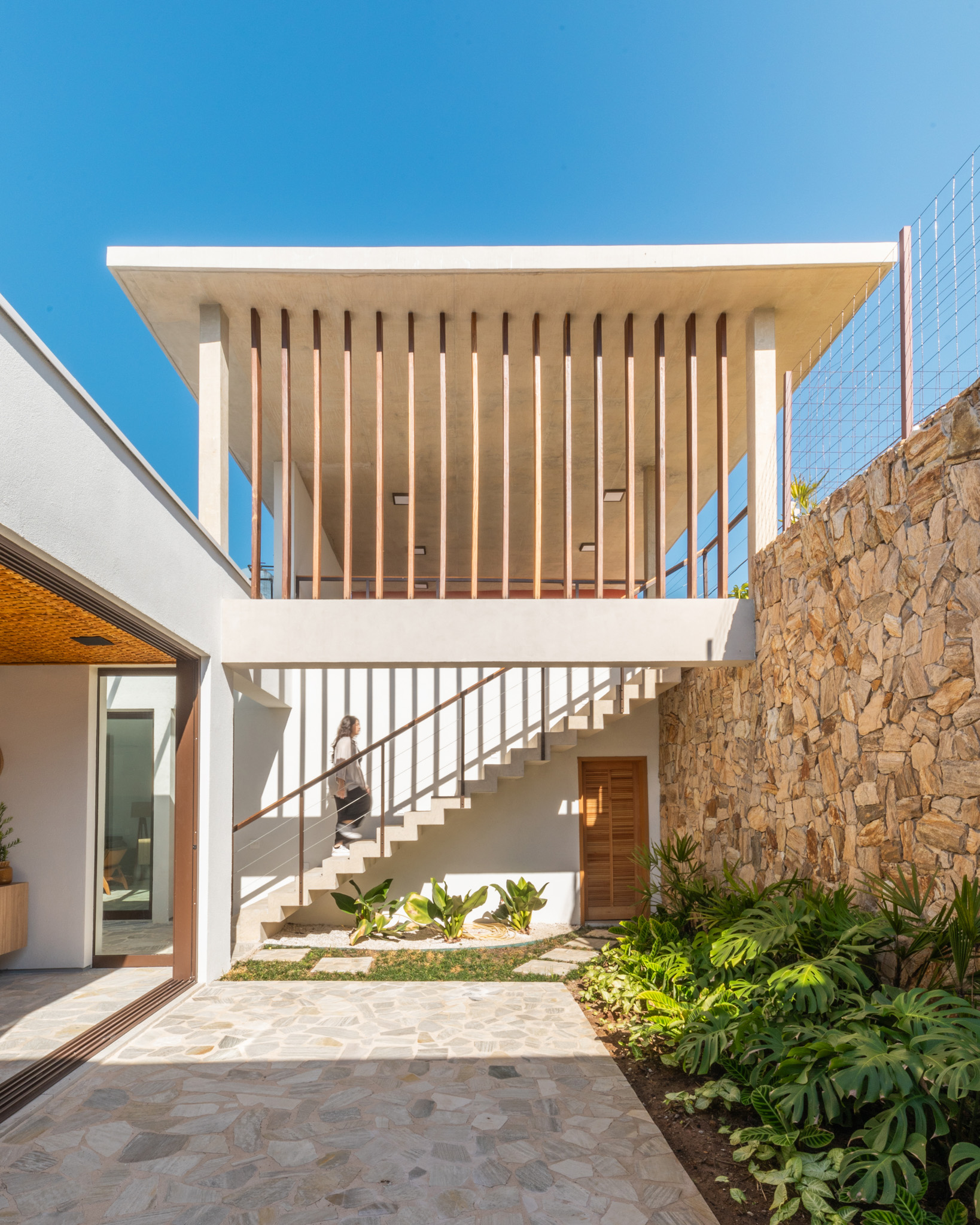 A circulação da casa segue o declive natural do terreno, com uma alameda principal que conecta diversos ambientes e promove a sensação de fluidez entre os espaços. A área social, localizada no primeiro platô, foi projetada para proporcionar integração e uma experiência contínua entre interior e exterior, graças às grandes portas de vidro que permitem uma vista panorâmica da natureza ao redor. “Nosso objetivo foi criar um espaço para relaxar e conviver, onde a conexão com a natureza e o uso de materiais naturais proporcionassem uma sensação de calma e bem-estar”, diz Carolina Penna.