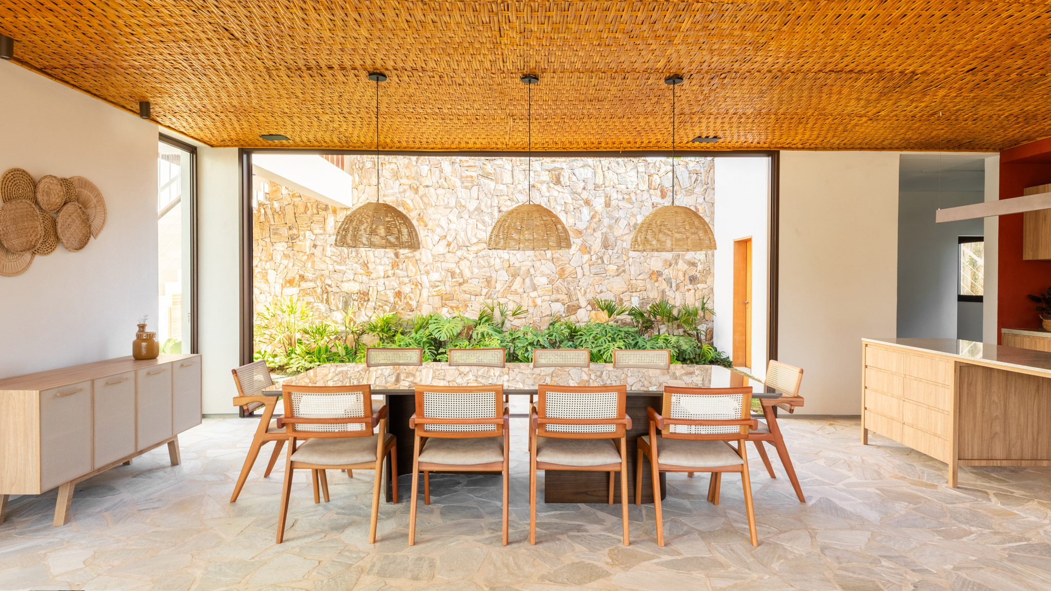 O projeto da Casa Três Tempos explora materiais rústicos e naturais para criar uma estética que respeita o ambiente. A pedra clara em caco nas áreas sociais e a pedra bruta nos muros e revestimentos trazem textura e rusticidade para o espaço. “Optamos por uma paleta de materiais simples e claros para refletir a leveza e a conexão com o ambiente natural. O uso de madeira nas marcenarias e acabamentos cria um ambiente acolhedor e sofisticado”, explica Carolina.
