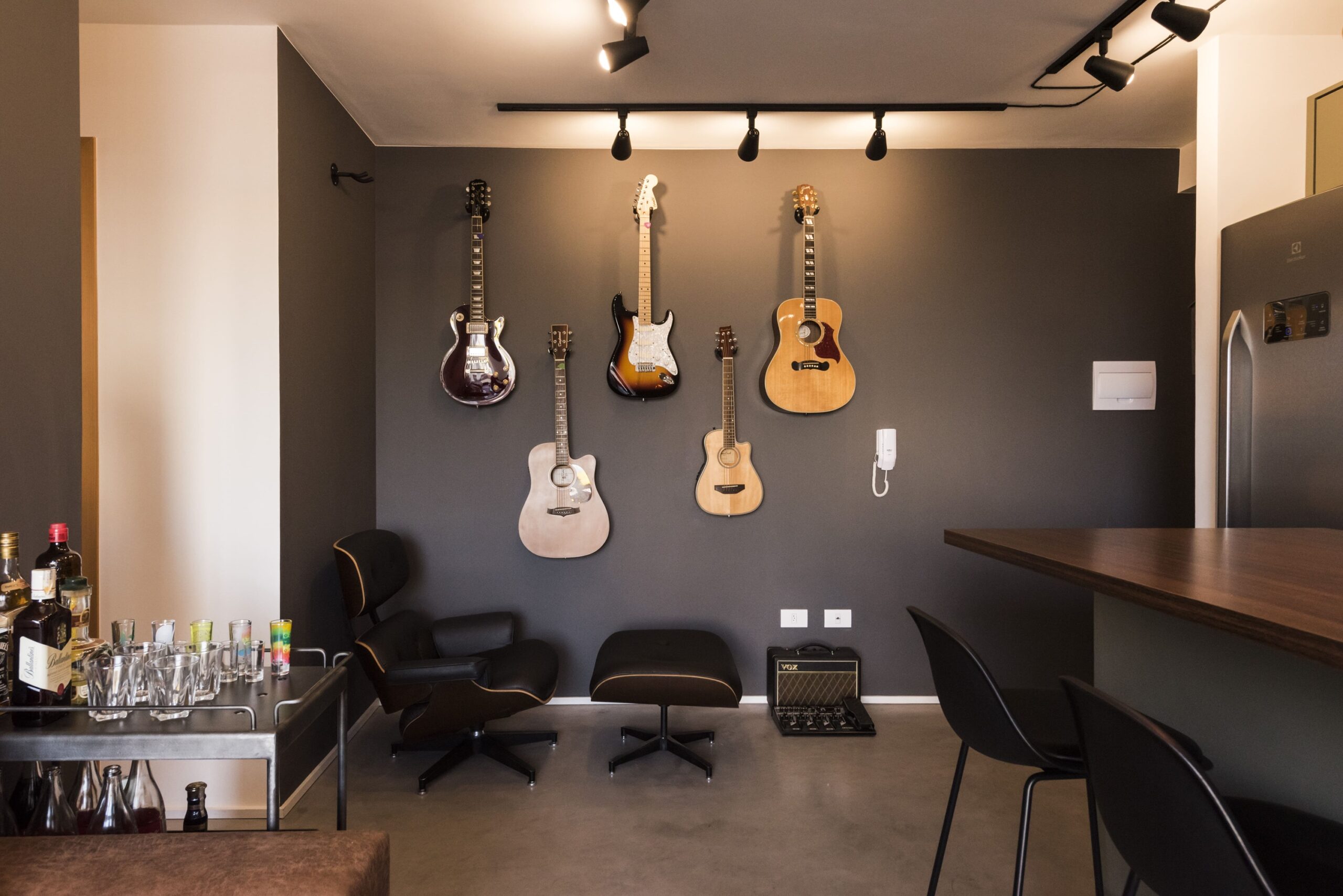 A paixão do morador por música se manifesta desde a entrada do apartamento, onde uma parede exibe guitarras e violões como obras de arte. A sala de estar integrada à cozinha reúne as soluções mais engenhosas da reforma, com piso de cimento queimado unificando os ambientes. A bancada de madeira se estende da cozinha para a sala, servindo de apoio para aparelhos eletrônicos e livros.