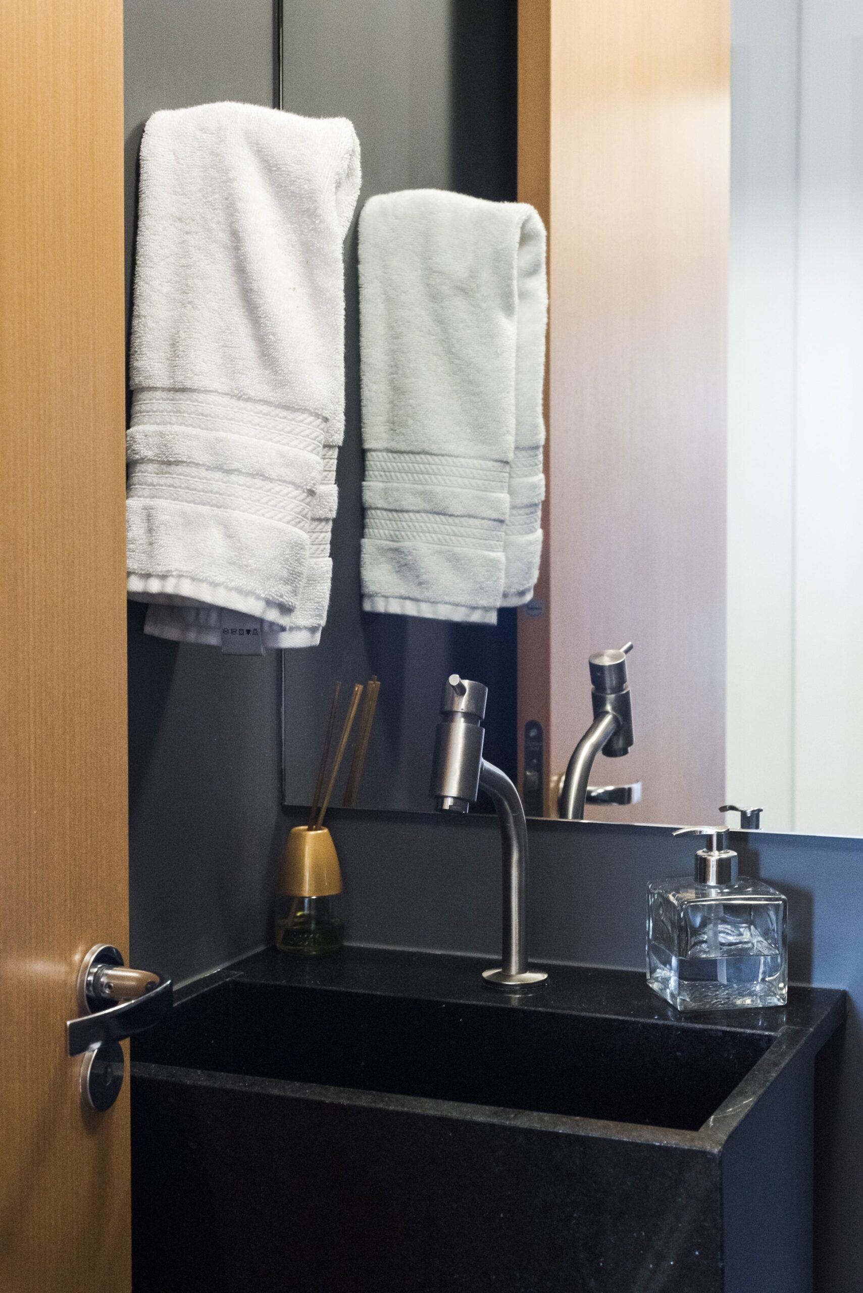 • Lavabo charmoso: O lavabo foi remodelado para combinar com a paleta de cores do apartamento, com uma cuba inteira em granito preto que agrega charme ao espaço.