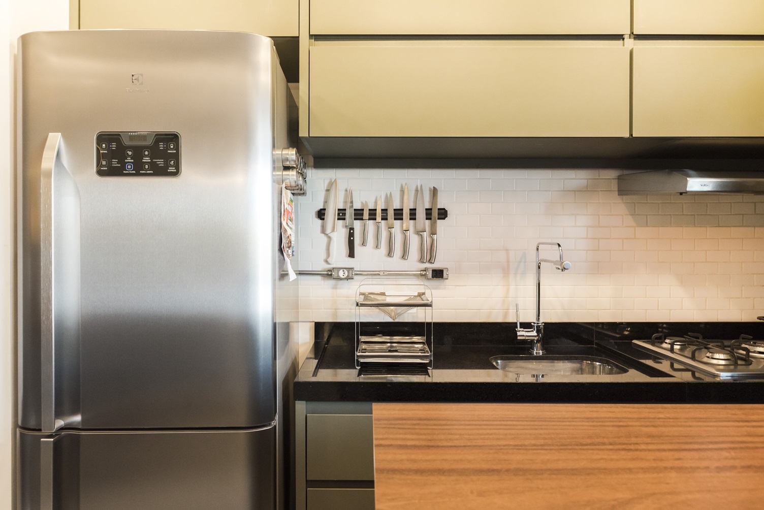 • Cozinha compacta e funcional: A bancada de pedra acomoda uma torneira tripla economizadora de espaço (água fria, filtrada e quente), um faqueiro na parede e uma geladeira de inox suficiente para as necessidades do morador.