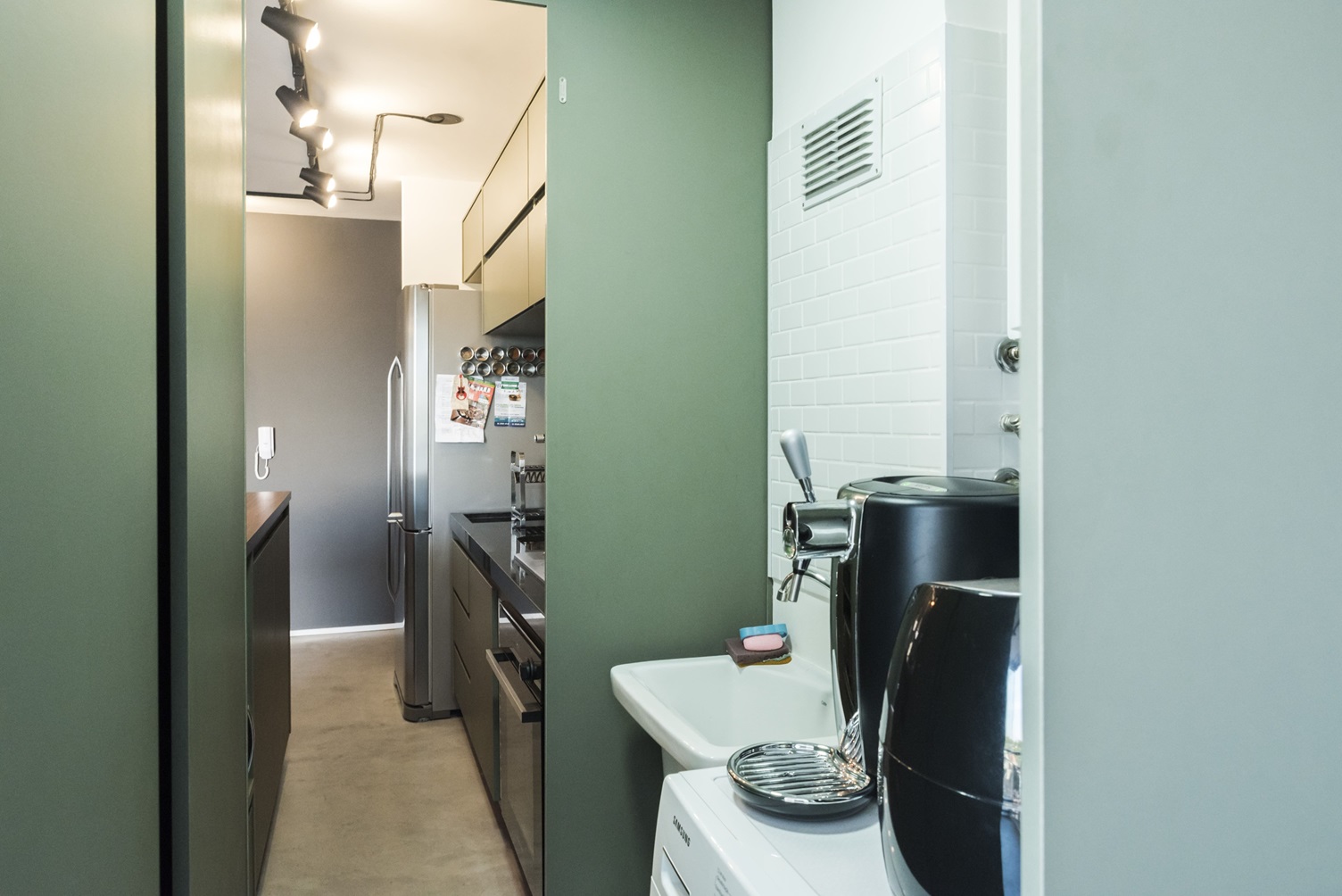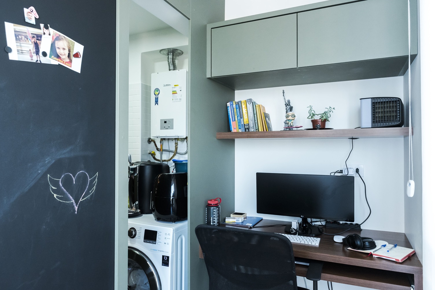 • Lavanderia otimizada: A lavanderia foi equipada com máquina de lavar e secar de 12 kg, além de armários com fundo falso para camuflar os cabeamentos.