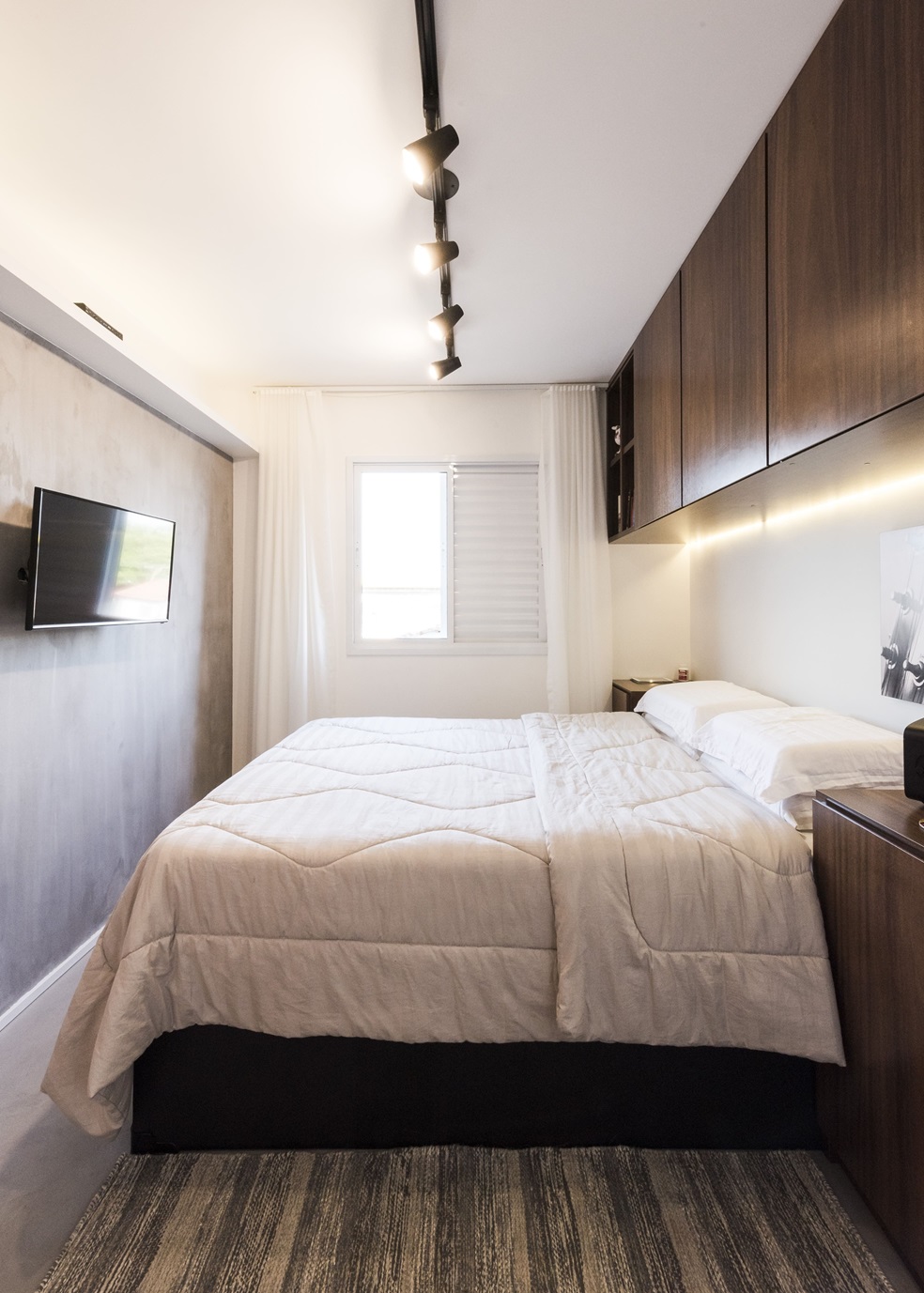 • Quarto com cama queen size: Para otimizar o espaço no quarto, foram instalados dois guarda-roupas na vertical e na horizontal, liberando espaço para uma televisão na parede.