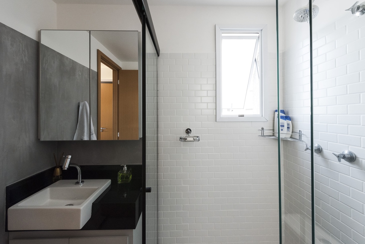 • Banheiro com box ampliado e armário camuflado: O banheiro da suíte segue o estilo industrial do apartamento, com revestimento subway tiles e box ampliado. Um armário camuflado atrás do espelho sobre a pia oferece organização e praticidade.