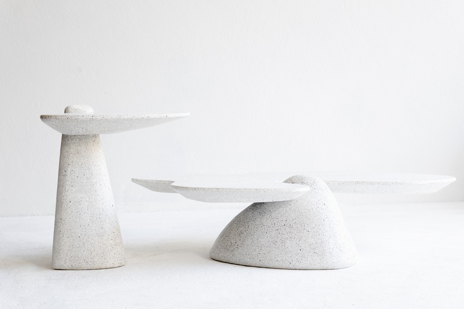 A linha é composta por mesas de centro em duas dimensões e uma mesa lateral, que exploram o concreto sob uma nova perspectiva: mais leve, orgânica e tátil. Os tampos de contornos irregulares e as bases esculturais evocam o movimento característico da arquitetura brasileira, enquanto materiais como vidro laminado e aço corten ampliam o contraste entre densidade e delicadeza.