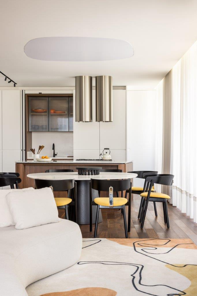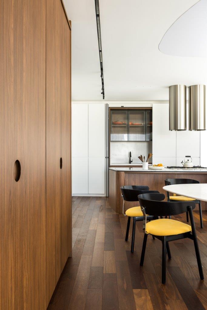 No living integrado à cozinha, a materialidade cumpre papel fundamental na definição de usos e atmosferas. A marcenaria em madeira aquece a área social, enquanto a cozinha, marcada pela leveza do branco, estabelece um contraste equilibrado e contemporâneo. Essa base neutra — composta por madeira, branco e preto — funciona como pano de fundo para as histórias pessoais dos moradores.