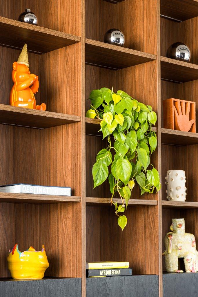 A resposta veio por meio de uma arquitetura silenciosa, onde a segurança está incorporada ao desenho. Formas arredondadas, marcenaria sob medida e soluções multifuncionais cumprem papéis essenciais sem chamar atenção para si. Um exemplo emblemático é a estante que acompanha a escada: além de funcionar como guarda-corpo, abriga um depósito discreto sob o vão, otimizando espaço e reduzindo riscos. Já as portas escamoteáveis da cozinha e do bar aliam elegância e praticidade, permitindo controlar o acesso dos pequenos a esses ambientes de forma natural.