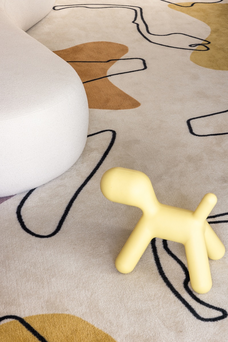 Uma dessas narrativas aparece no tapete da sala, desenhado pela própria moradora, que traz referências às pistas dos Grandes Prêmios de Fórmula 1 e às cores que as representam. O elemento adiciona uma camada afetiva ao projeto e reforça a ideia de que o design de interiores também é ferramenta de expressão.