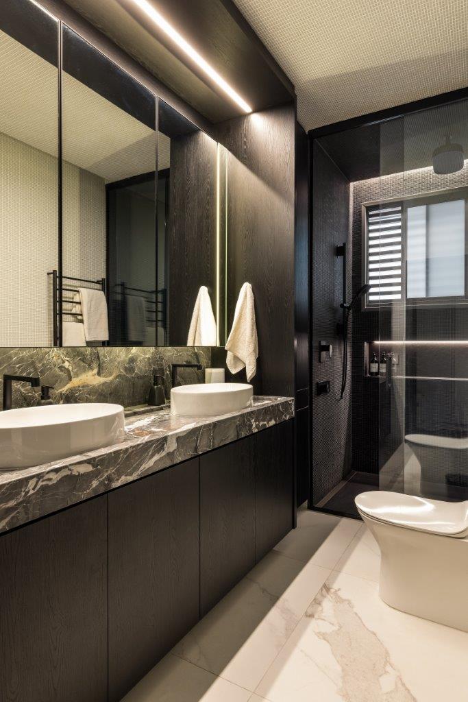 A varanda amplia a proposta de convivência e lazer ao abrigar spa, brinquedoteca e paisagismo assinado pelo escritório Mogá, criando um espaço híbrido que dialoga com diferentes momentos da rotina familiar. No pavimento superior, dedicado à área íntima, a coerência estética se mantém. A suíte principal, ponto alto do conjunto, combina madeira, branco e preto em um ambiente que convida ao descanso com sofisticação e serenidade.