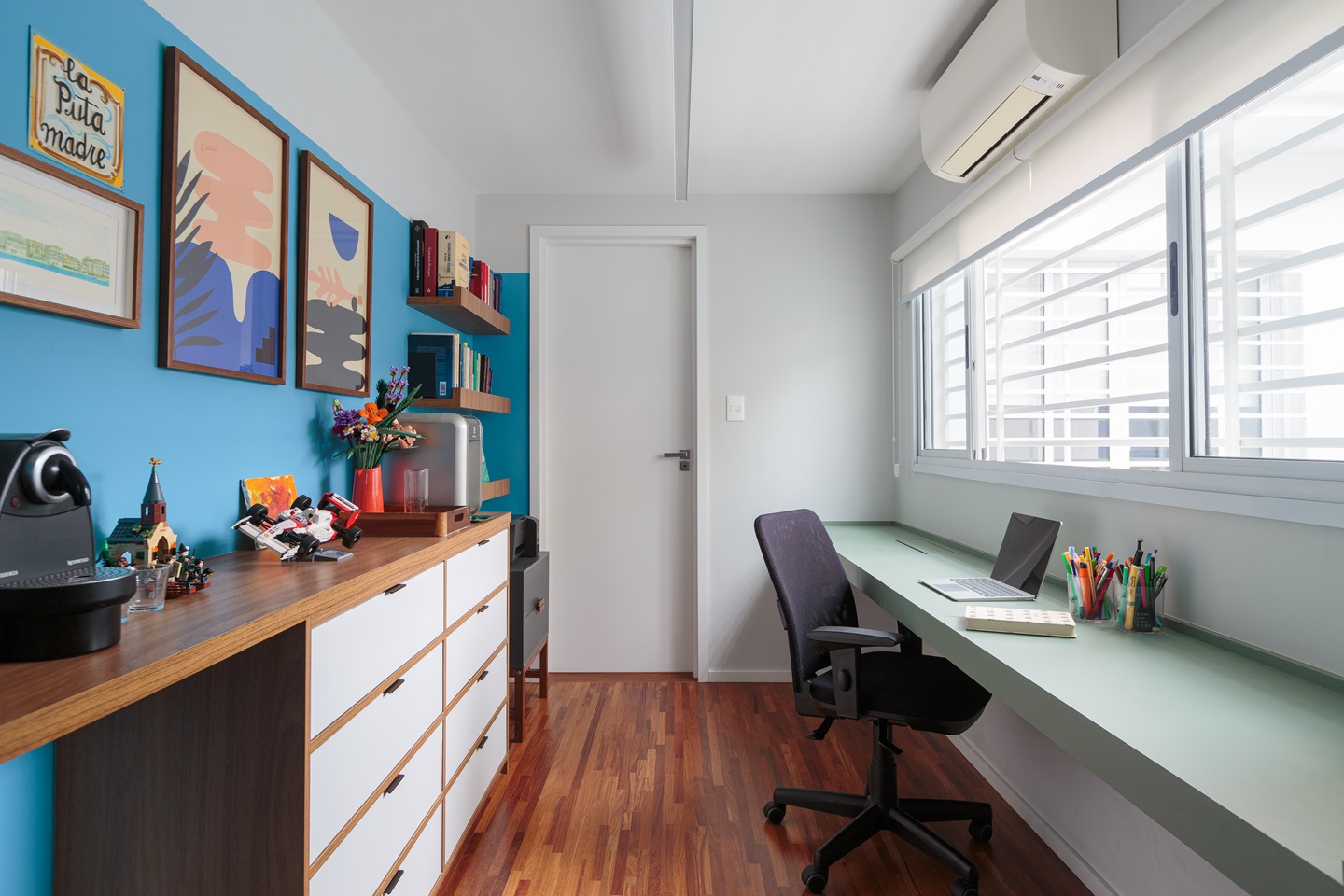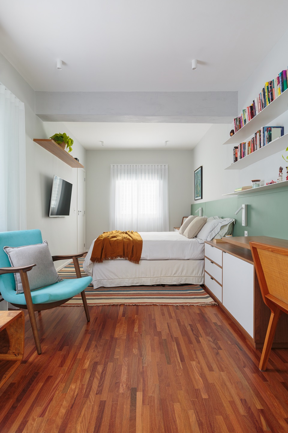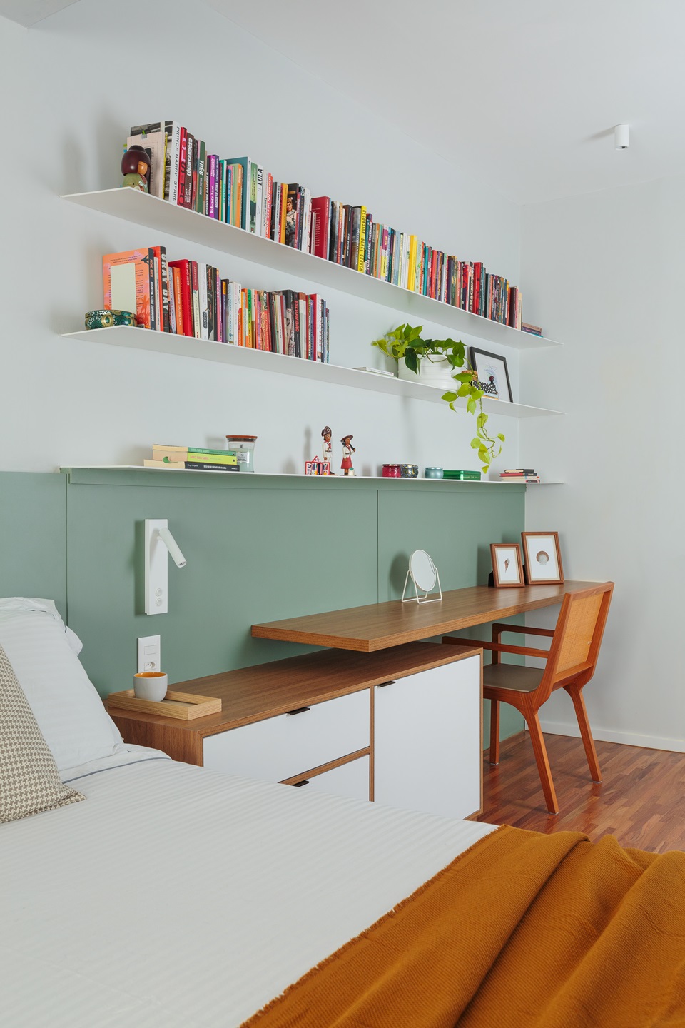 O quarto do casal foi completamente repensado para abrigar, além da cama, um espaço de trabalho funcional e uma elegante penteadeira. Uma parede com mais de seis metros de largura foi inteligentemente projetada para integrar esses elementos, juntamente com uma estante em serralheria que adiciona um toque de sofisticação ao ambiente.