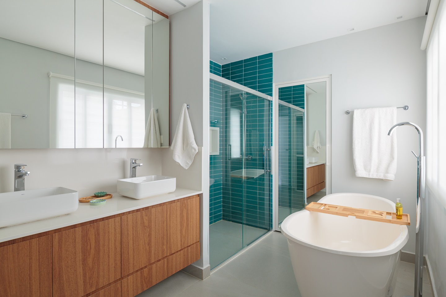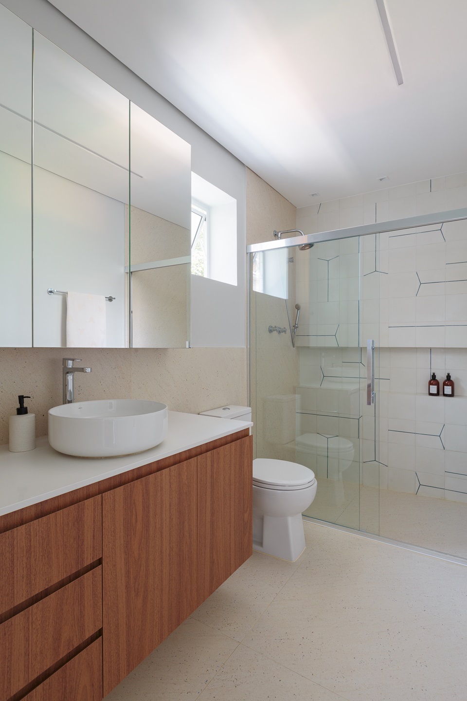 As esquadrias da Hertz Esquadrias trouxeram novas janelas amplas para a sala e o quarto do filho, além de um brise camarão que garante maior privacidade. As cubas elegantes dos lavabos são da Konkre, e as bancadas foram produzidas pela Marmoraria Paulista, complementando com perfeição o conceito de elegância e funcionalidade que permeia todo o projeto do Estúdio Maré.