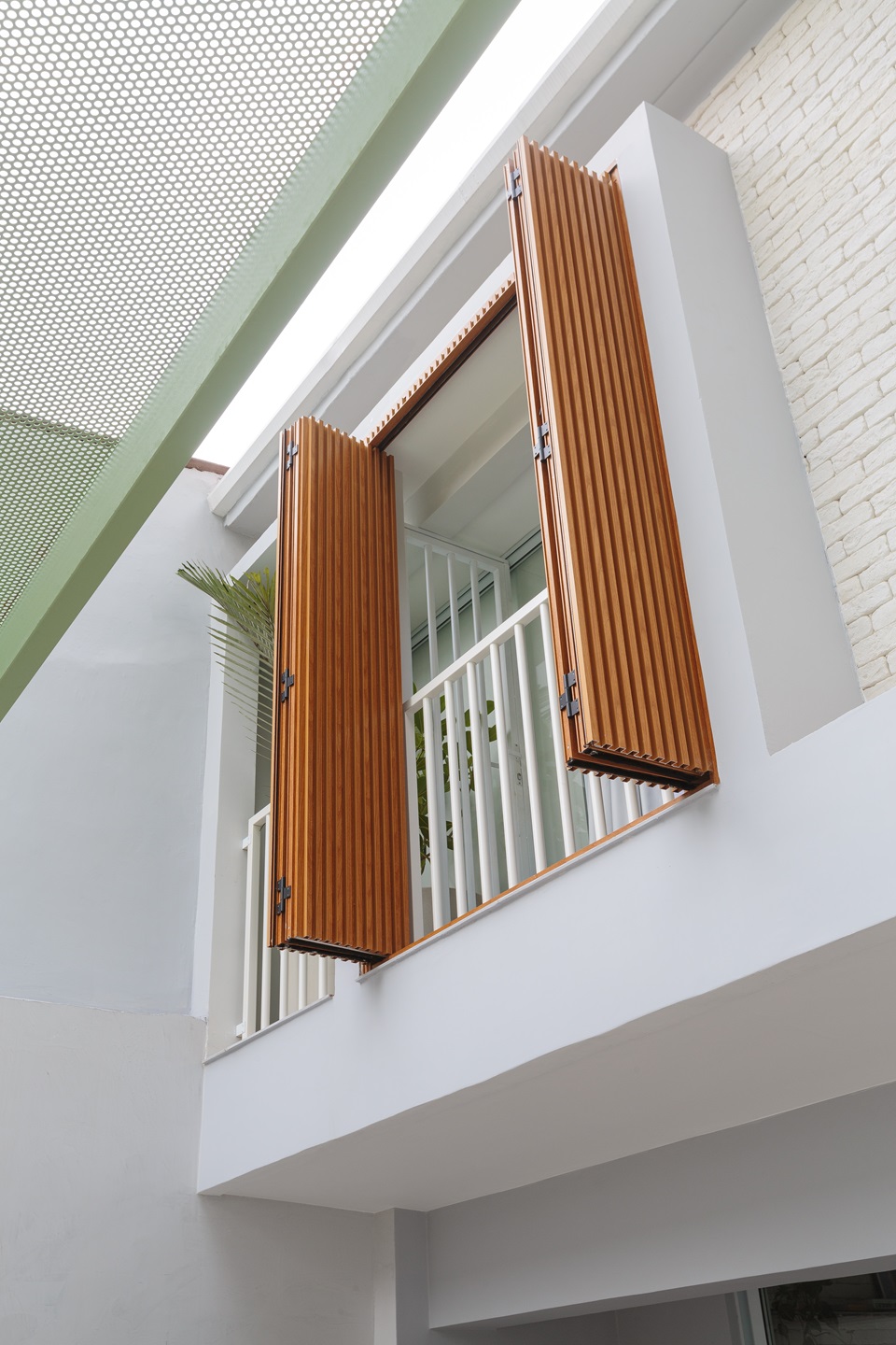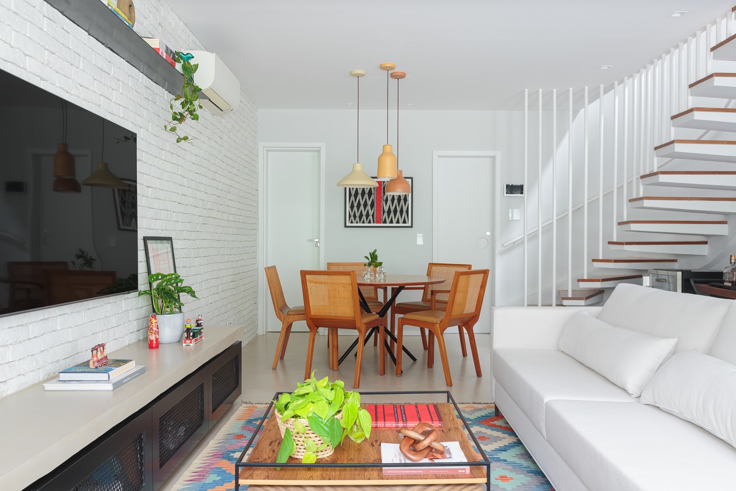 A escada existente foi inteligentemente integrada ao novo design, com a adição de tubinhos de serralheria branca que valorizam o elemento arquitetônico, ao mesmo tempo em que garantem a segurança. No pavimento superior, o piso de madeira original foi restaurado, preservando a história e a essência da casa.