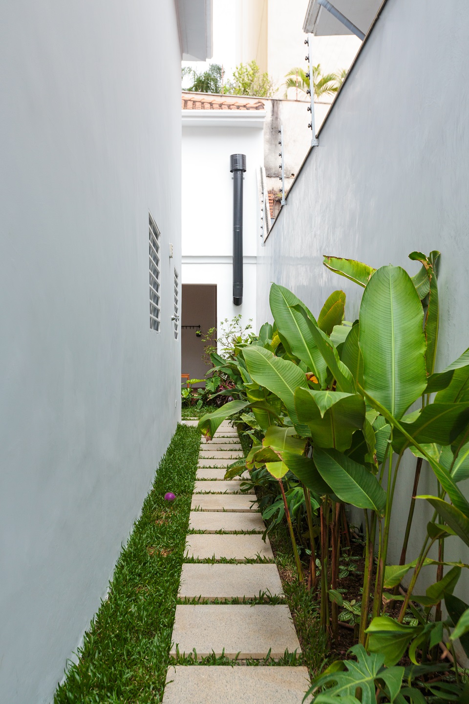 A intervenção mais impactante ocorreu no pavimento térreo, onde a antiga configuração da cozinha cedeu espaço a um novo layout que a integra harmoniosamente ao quintal, antes um espaço isolado e sem vida. A simples abertura de uma porta conectando a cozinha aos fundos da casa revolucionou a dinâmica do lar, inundando os ambientes com luz natural e fomentando a interação entre as áreas interna e externa.