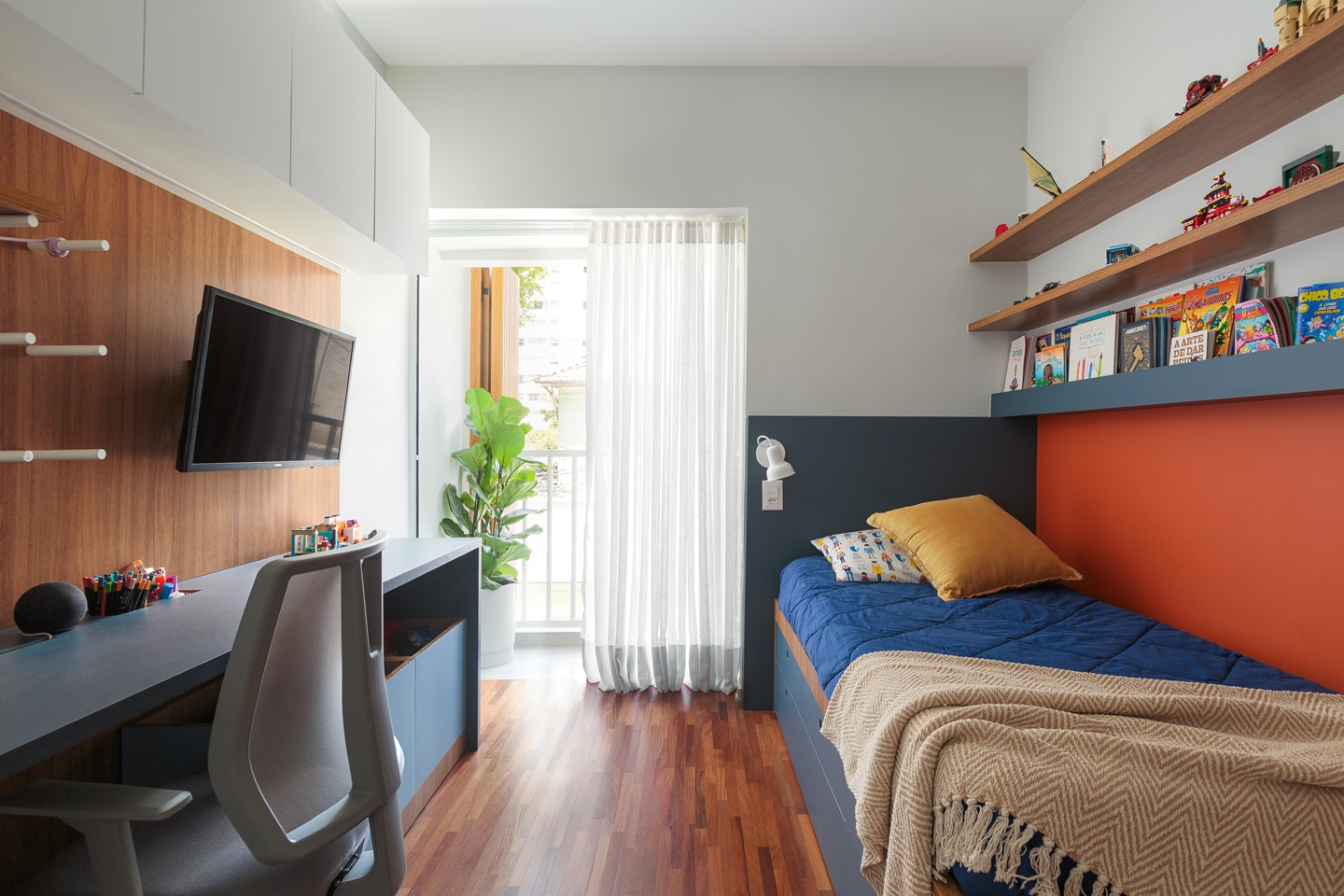 Os espaços íntimos também receberam atenção especial. O quarto e o banheiro do filho foram reformados para otimizar o espaço, criando um ambiente mais funcional para estudos e brincadeiras. Um novo closet foi projetado para liberar espaço no quarto, proporcionando mais liberdade para as atividades diárias. O banheiro de apoio, que também serve como lavabo para hóspedes, foi concebido com acabamentos atemporais, garantindo sua relevância estética ao longo do tempo.