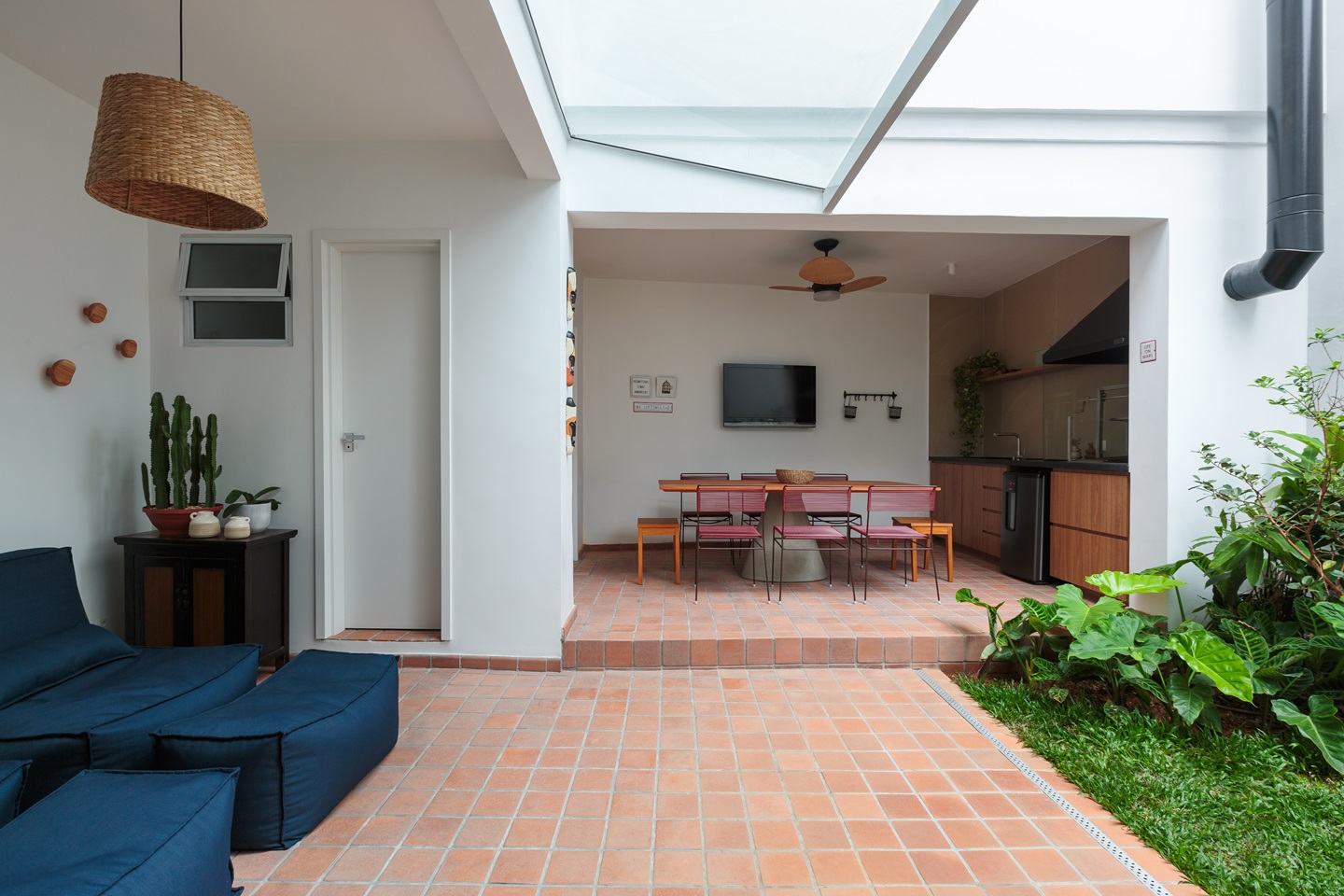 A sala de estar passou por uma reconfiguração completa, ganhando um banco moldado em concreto que otimiza o uso do espaço e oferece novas possibilidades de interação. O piso monolítico, estendendo-se pela sala, lavabo e cozinha, unificou visualmente os ambientes, proporcionando leveza e destacando o mobiliário e detalhes charmosos, como o piso de ladrilho azul na entrada da residência.