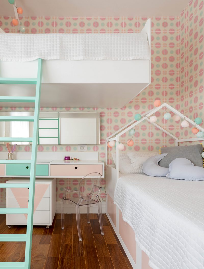Neste projeto do escritório TT Interiores, o quarto de 9 m² tornou-se o ambiente perfeito para duas irmãs brincarem, descansarem e curtirem a infância com muita alegria.