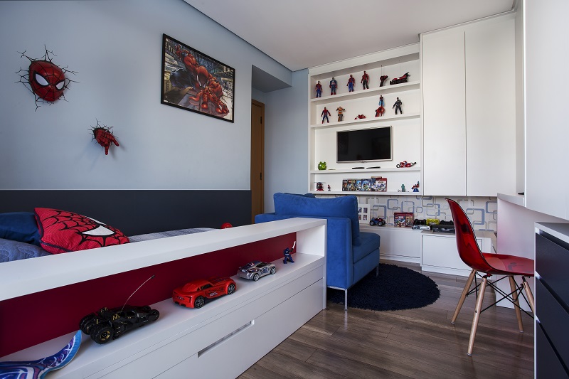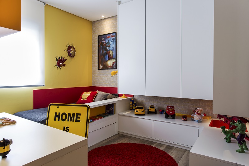 O papel de parede facilita a manutenção das paredes e destaca o móvel suspenso superior, cujo truque é o de deixar o dormitório com sensação se ser maior e ter mais móveis do que parece. Em cada dormitório, foram mantidas as cores de preferência de cada um dos filhos e dos personagens preferidos: um gosta do Homem de Ferro e o outro gosta do Homem Aranha.