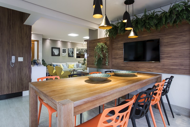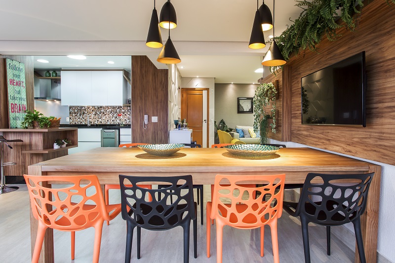 A beleza deste ambiente fica por conta do contraste criado com as cores mais quentes, como o laranja das cadeiras, e o preto. Integrada à sala de estar e à cozinha, a mesa de jantar que fica na varanda é extremamente relaxante e aproveitada em todos os momentos. Trata-se de uma verdadeira área de lazer, por isso, a designer optou por alguns elementos mais rústicos e abusou do uso da madeira e do verde. A ideia era trazer a natureza para dentro de casa. Destaque para a mesa de madeira de demolição e as cadeiras de poliuretano moldado.