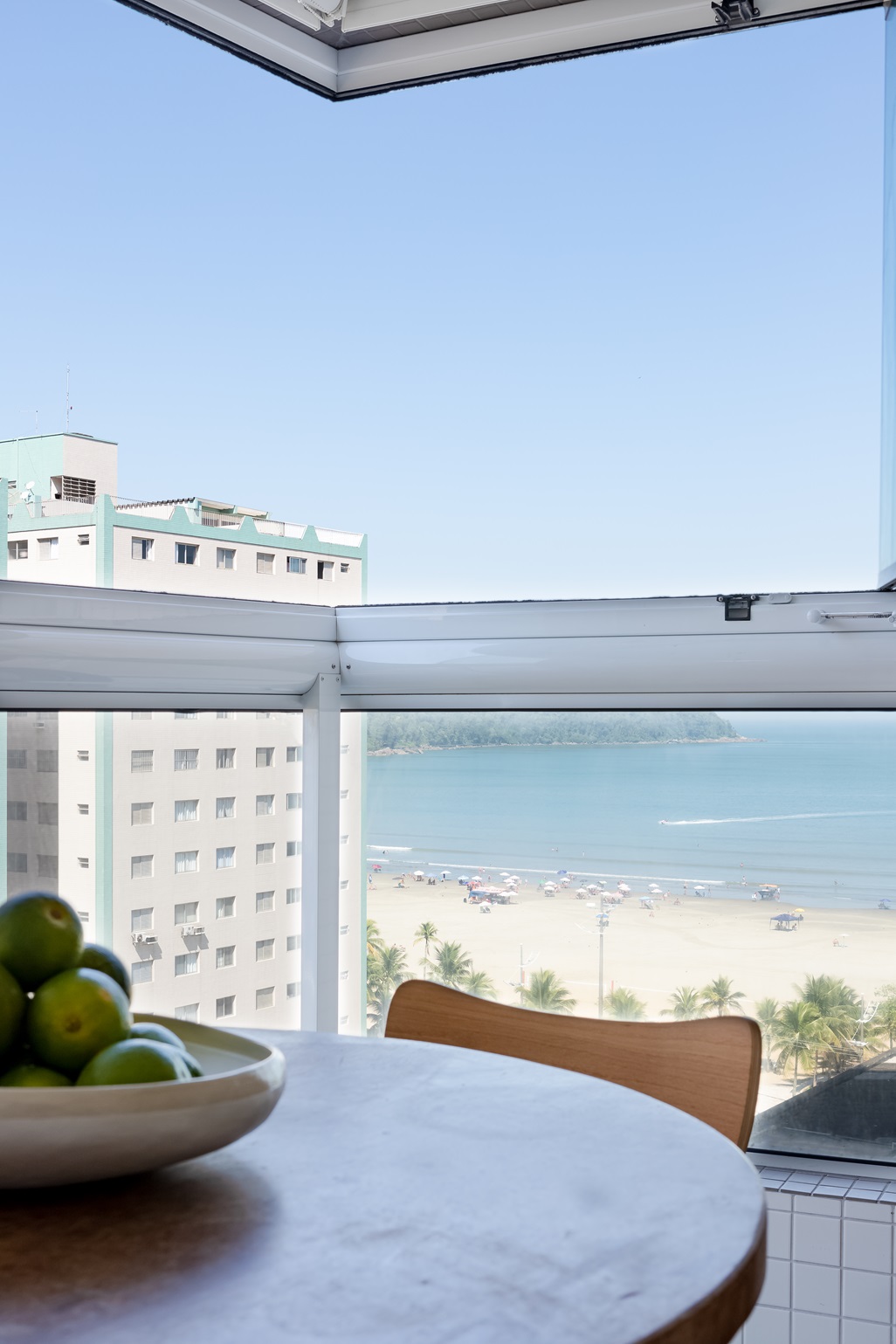 A suíte principal, por sua vez, é um espaço que reúne o rústico e o industrial, com uma parede de tijolos brancos e uma porta de celeiro. A varanda e a área de serviço foram otimizadas para proporcionar mais praticidade no dia a dia, sem perder o charme da atmosfera praiana do local.