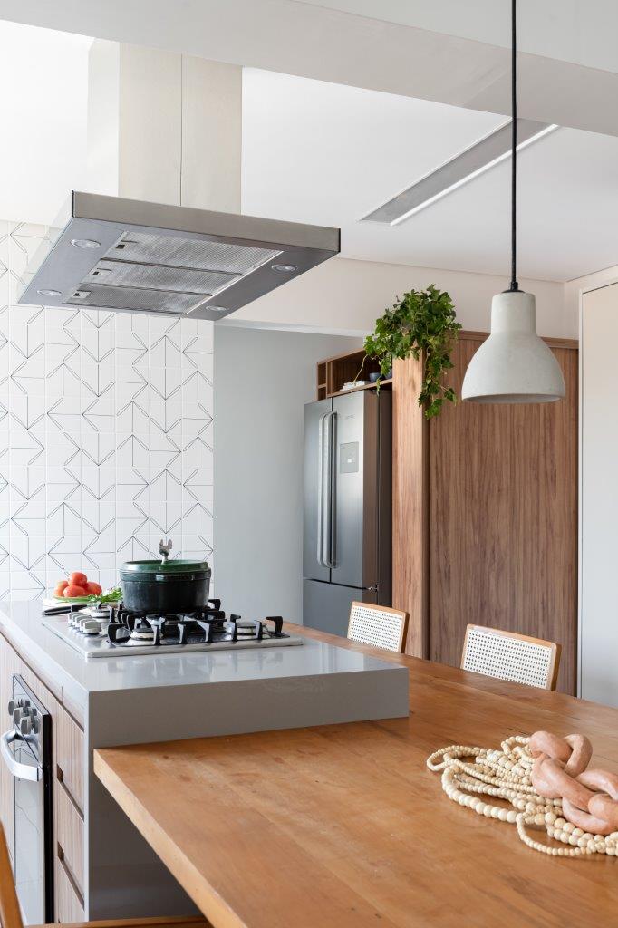 A integração dos espaços foi fundamental para criar uma atmosfera mais ampla e convidativa. A cozinha, antes isolada, agora se conecta à área social, tornando-se o coração da casa. A mesa de madeira na ilha central, além de ser um ponto de encontro, simboliza a união e a força da família.