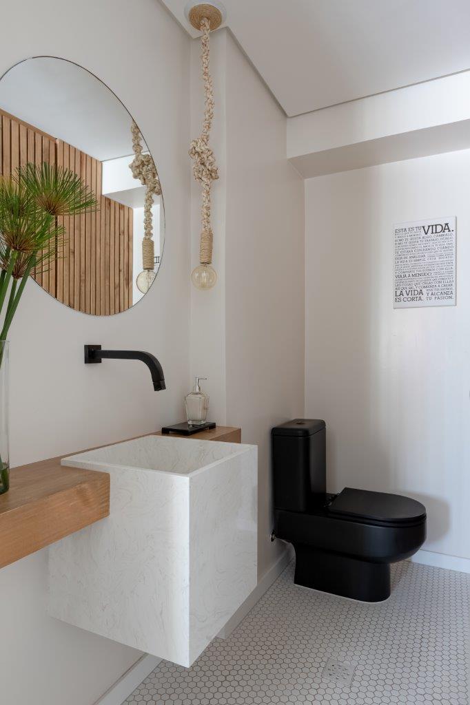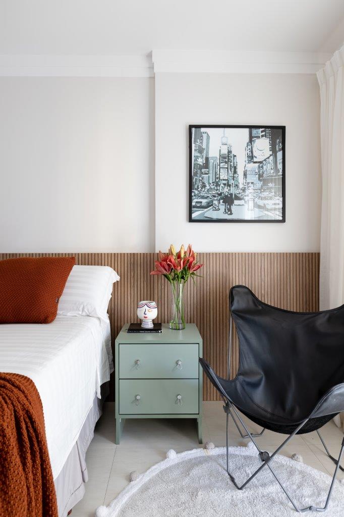 Cada detalhe do projeto foi cuidadosamente pensado para atender às necessidades e aos desejos da cliente. O lavabo, por exemplo, recebeu um toque de sofisticação com uma cuba que combina madeira natural e mármore Pigues. Nos quartos, a arquiteta utilizou acabamentos neutros e detalhes como um painel ripado de madeira na suíte de hóspedes para criar um ambiente aconchegante e convidativo.