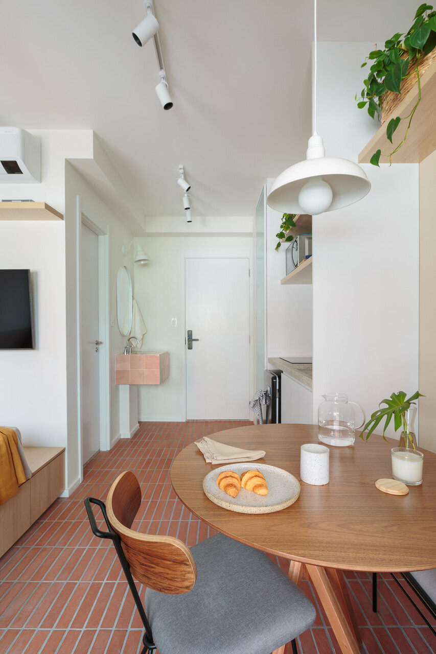 Com a crescente demanda por locação temporária em São Paulo, o Estúdio Maré buscou criar um ambiente que atendesse às necessidades dos hóspedes, oferecendo conforto e praticidade. O piso artesanal em terracota aquece o ambiente, enquanto marcenarias estratégicas, como gavetas na cama e um guarda-roupas compacto, otimizam o espaço.