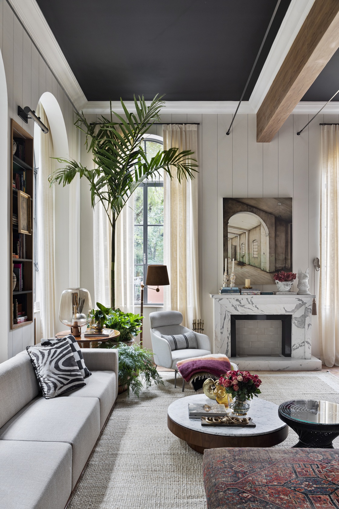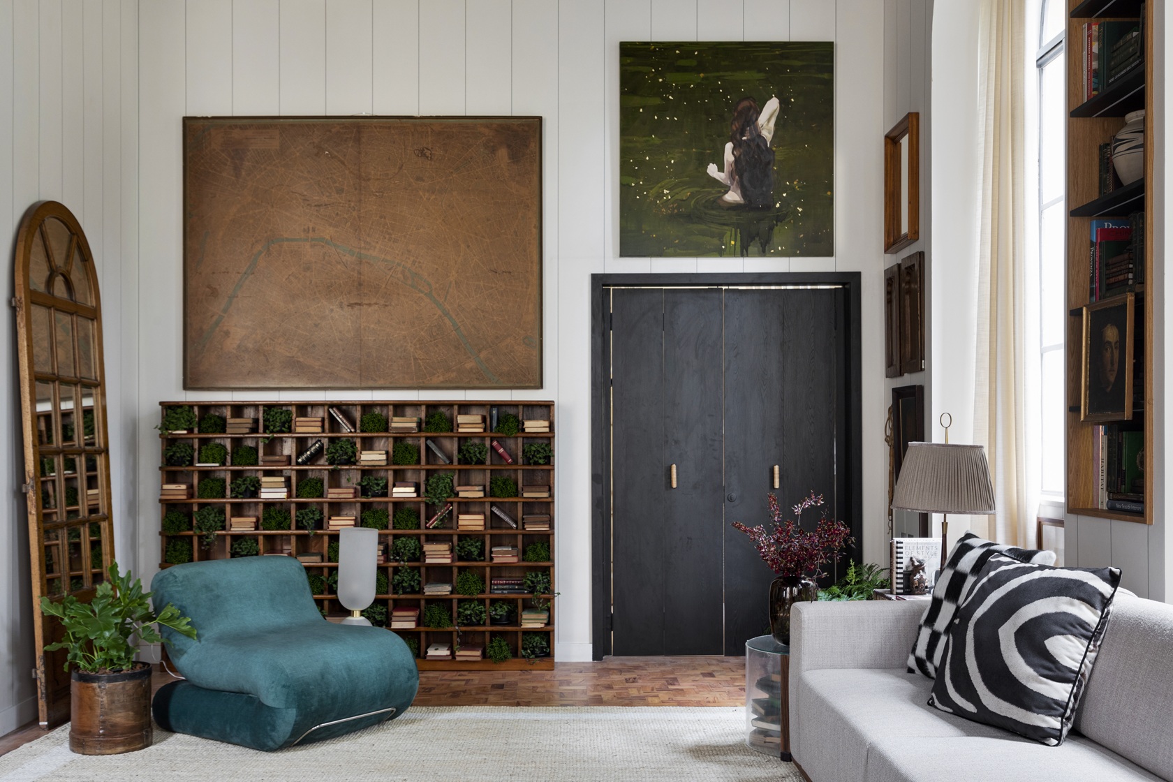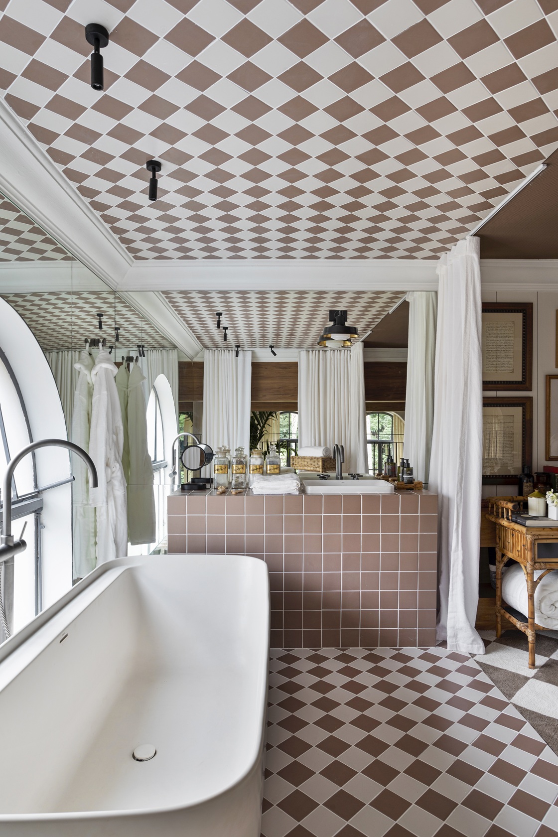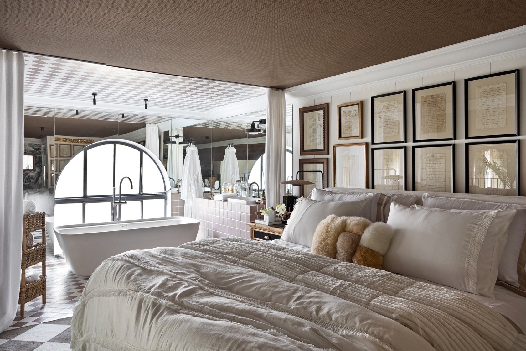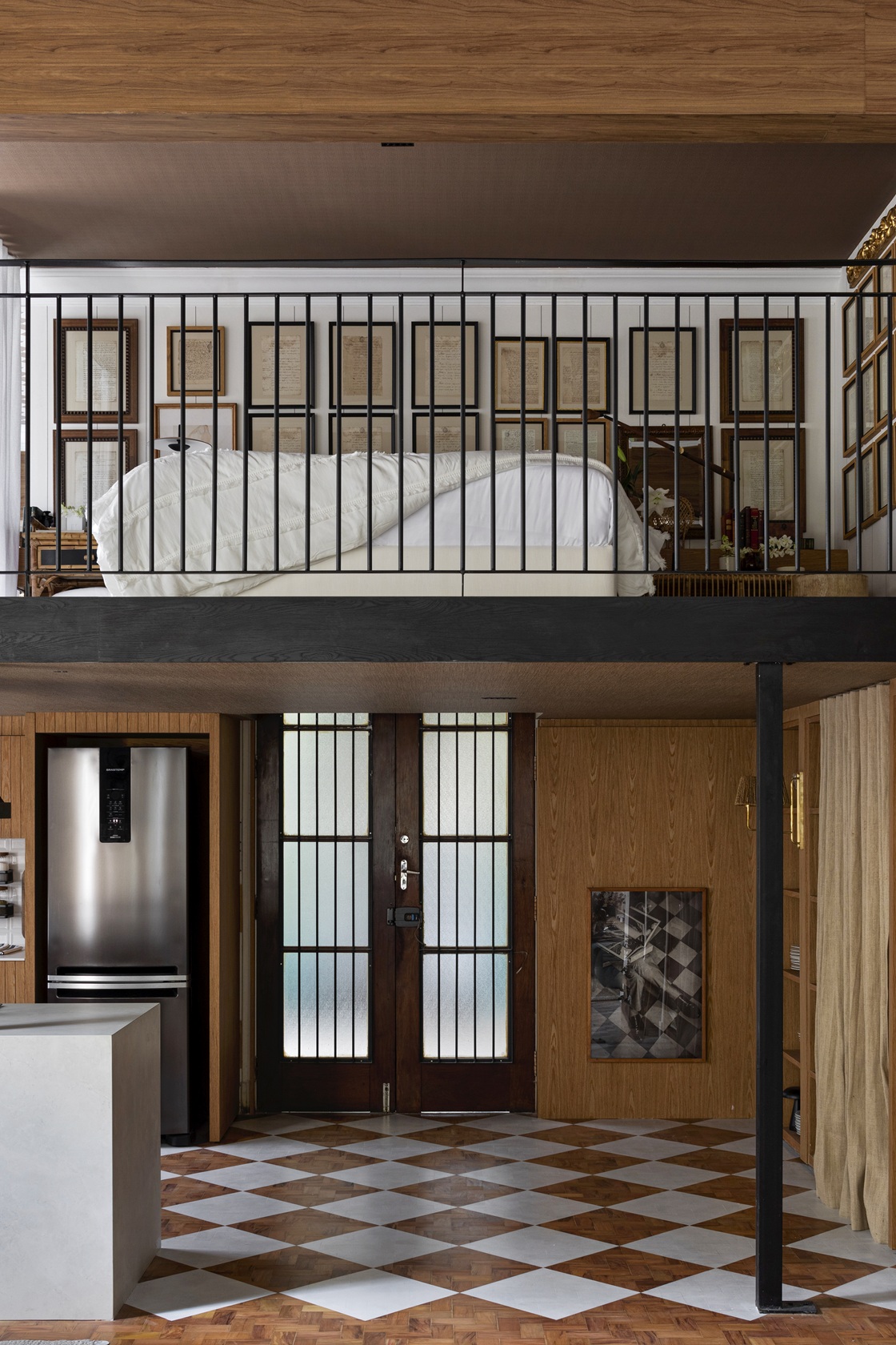 O design de interiores é um diálogo constante entre o novo e o antigo, o funcional e o artístico. O piso em parquet antigo, um tesouro preservado, ganha uma releitura contemporânea com uma pintura gráfica em losangos, um padrão que sutilmente se repete no carpete do quarto e de forma marcante no banheiro, unindo os espaços com um fio condutor elegante. A imponente lareira, revestida com a nobreza da pedra da Boutique della Rocca e executada pela Santorini Mármores, se torna um ponto focal, emoldurando uma expressiva obra de Andrey Rossi. A história do local é reverenciada através de um quadro com imagem de arcos, que ecoam a arquitetura original das janelas, e uma elegante porta de espelho arqueada do Arnaldo Danemberg Collection, que amplia o espaço e reflete a luz com graça.