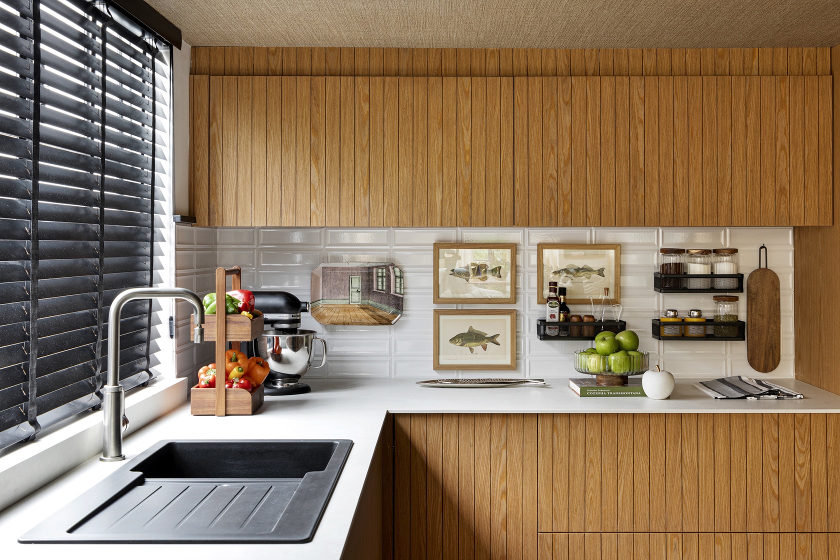 As soluções práticas e estéticas se entrelaçam com maestria. Os armários e estantes da cozinha, assinados pela Líder Interiores, demonstram como o mobiliário funcional pode ser sinônimo de design apurado. A marcenaria sob medida, presente em diversos pontos do estúdio, otimiza espaços e exibe um refinamento artesanal que enriquece a experiência de morar. A atenção aos detalhes se estende à louçaria e ao enxoval da Casa Riachuelo, que adicionam camadas de aconchego e imprimem a personalidade singular do espaço.