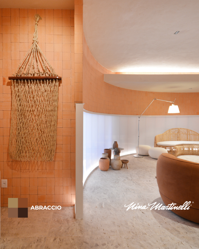 Goiás. Em cerâmica natural, e remetendo ao Peach Fuzz, cor do ano Pantone 2024, o Abraccio é feito artesanalmente, peça a peça, com práticas sustentáveis. Com sua naturalidade e pegada orgânica, Abraccio é infalível em projetos que exploram a belo,