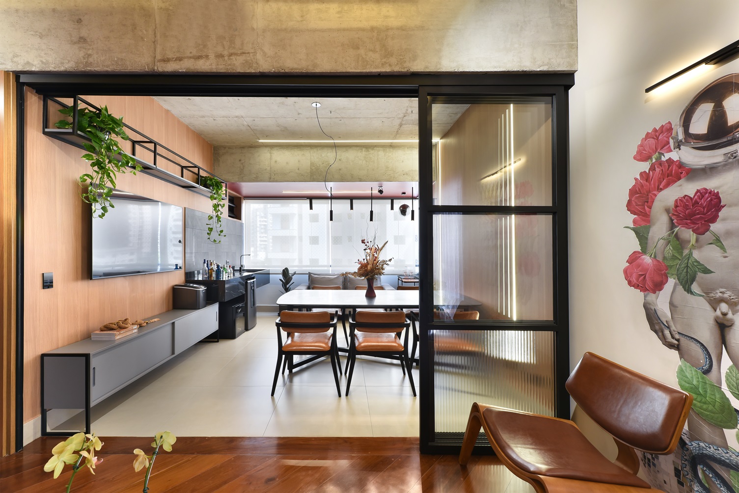 O hall de entrada privativo dá o tom para o que está por vir. O porcelanato Splendor Nero da Helena Porcelanato, aplicado nas paredes e no teto, cria um efeito visual marcante e sofisticado. A frase em neon “Sejam bem viados” reforça a personalidade vibrante dos moradores e serve como um convite para entrar em um lar cheio de vida.