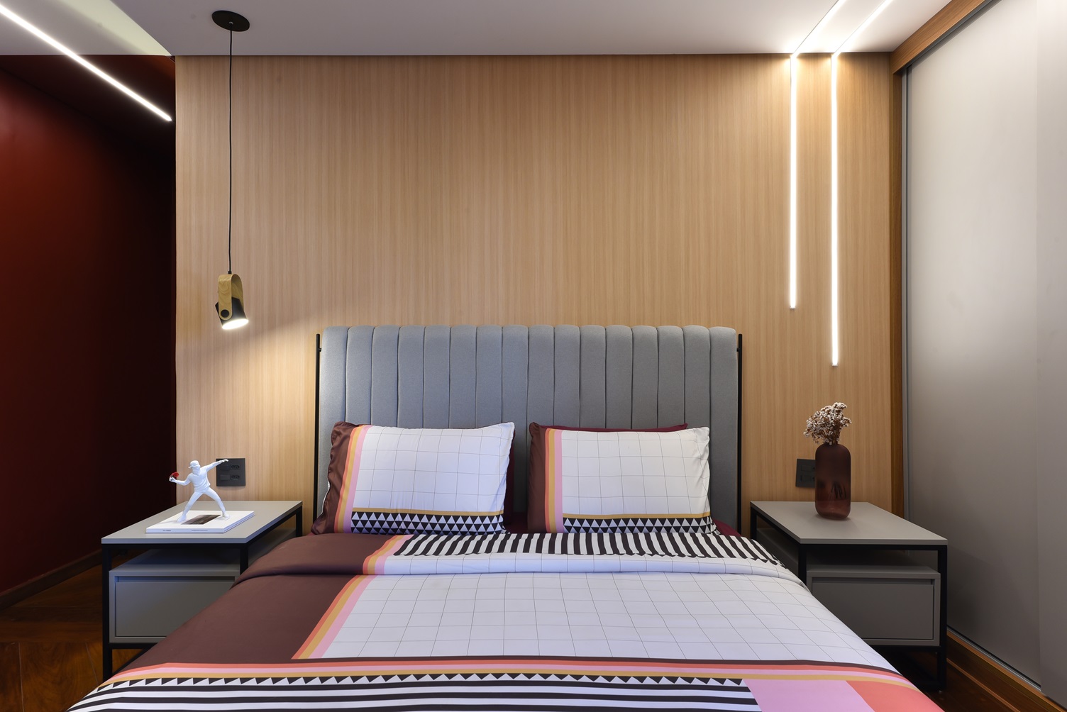 A suíte master mantém a linguagem contemporânea do apartamento, com a parede da cabeceira revestida em adesivo vinílico em tom suave de madeira, em harmonia com o piso original restaurado. A marcenaria em madeira amendoada e o MDF cinza claro criam uma atmosfera aconchegante e sofisticada. A parede de castelatto aparente com acabamento em concreto adiciona um toque industrial, refletindo o gosto pessoal dos moradores.