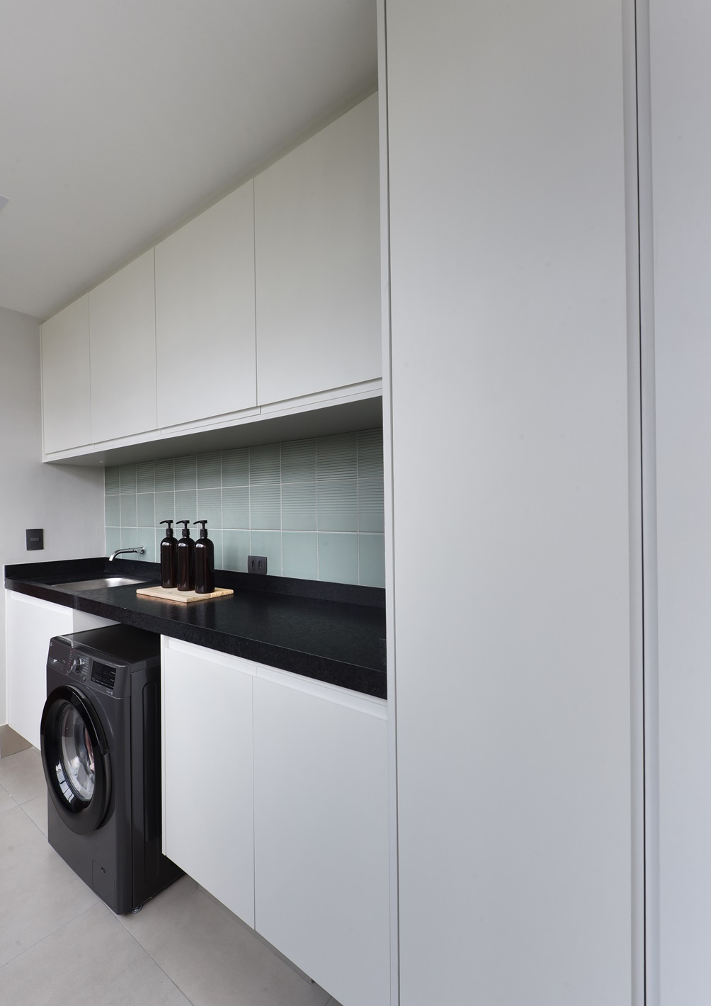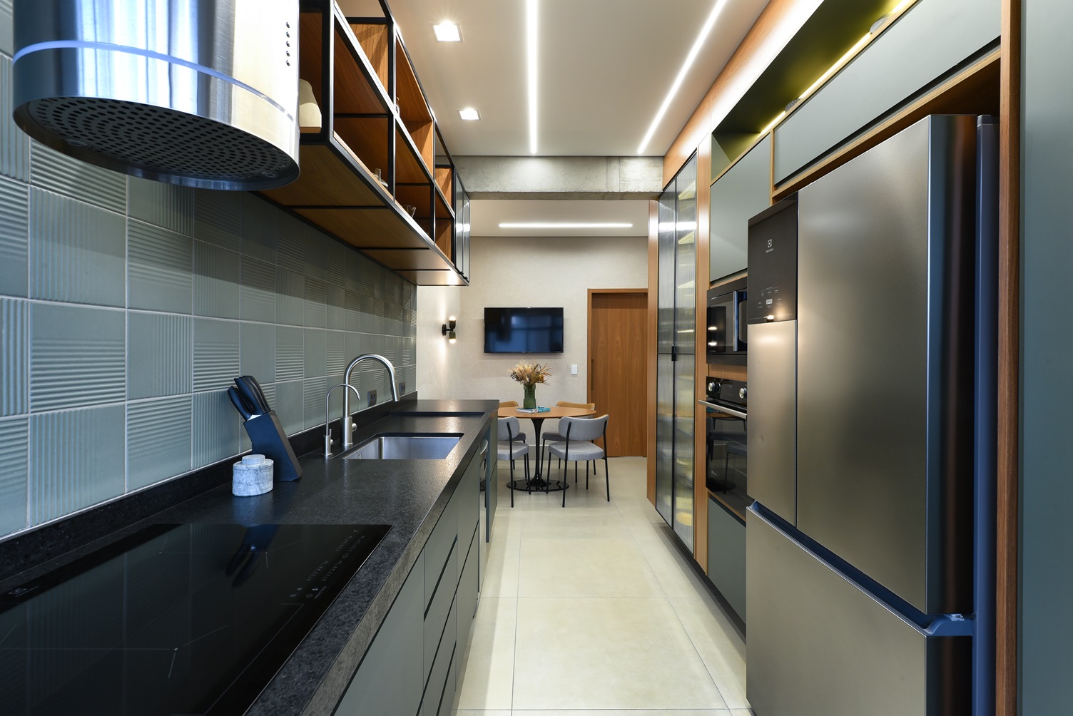 O lavabo é um ponto de destaque, totalmente revestido em porcelanato azul Hope Blue da Helena Porcelanato, incluindo uma bancada feita do mesmo material. A iluminação do espelho em LED RGB adiciona um toque contemporâneo, enquanto as portas invisíveis revelam uma área íntima composta por duas suítes e um espaço multifuncional.