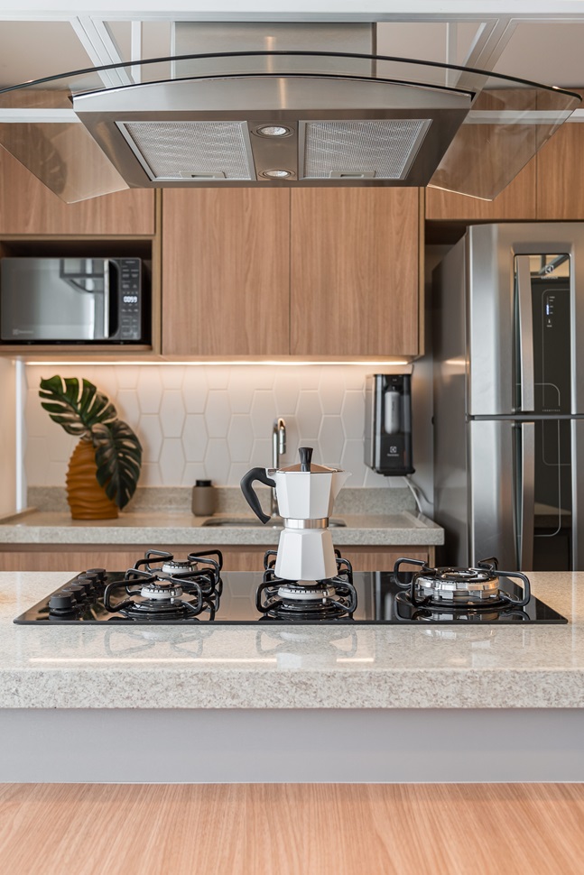 A marcenaria foi a chave para o sucesso do projeto, resolvendo questões de funcionalidade, armazenamento e estética de forma impecável. A cozinha, por exemplo, foi deslocada do centro da antiga sala para um local mais próximo da abertura de vidro, permitindo a criação de uma ilha gourmet integrada com a mesa de jantar. Uma solução prática e charmosa que otimiza o espaço e promove a interação social.