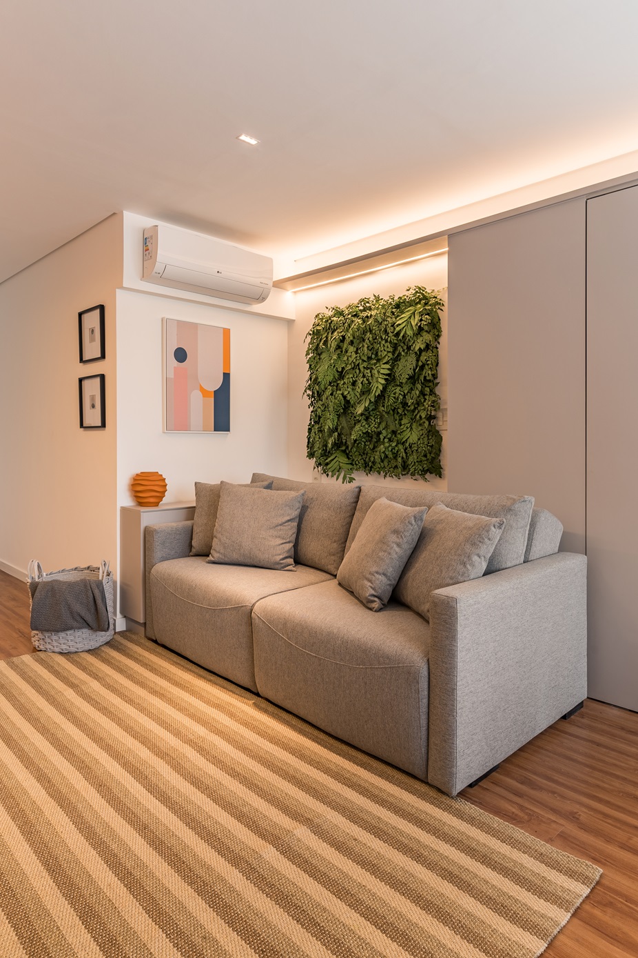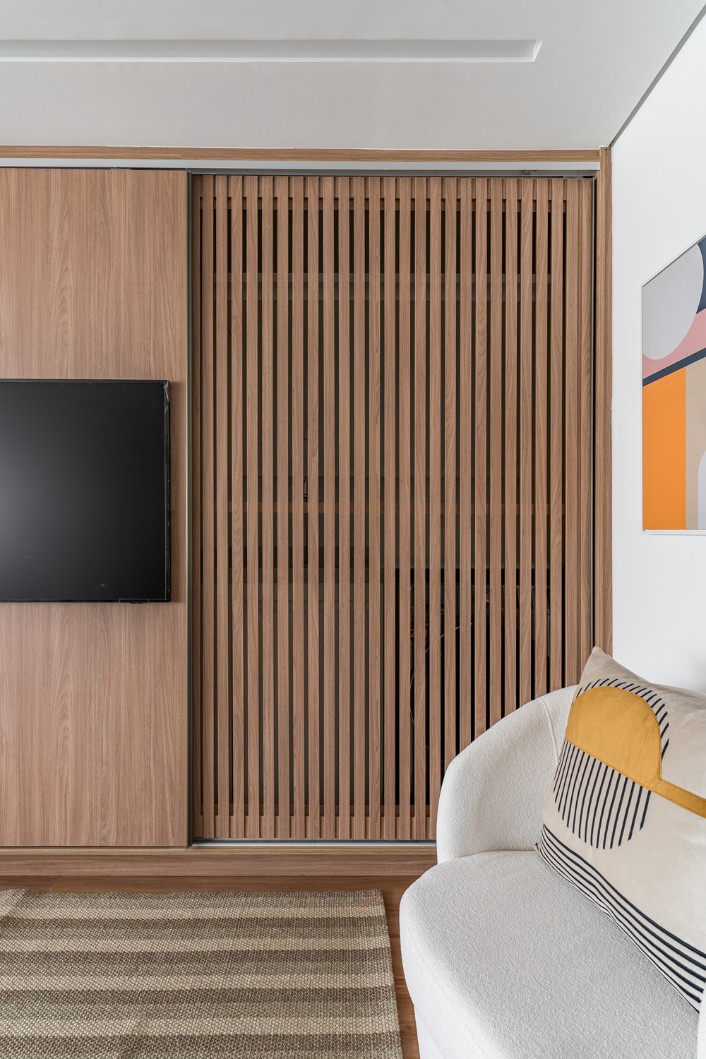 Para maximizar o aproveitamento do espaço, um grande armário com porta de correr foi instalado na sala. Uma solução inteligente que esconde a TV quando não estiver em uso, proporcionando um ambiente clean e organizado. O sistema de esteira que permite que a fiação acompanhe o movimento da porta de correr garante funcionalidade sem comprometer o design.