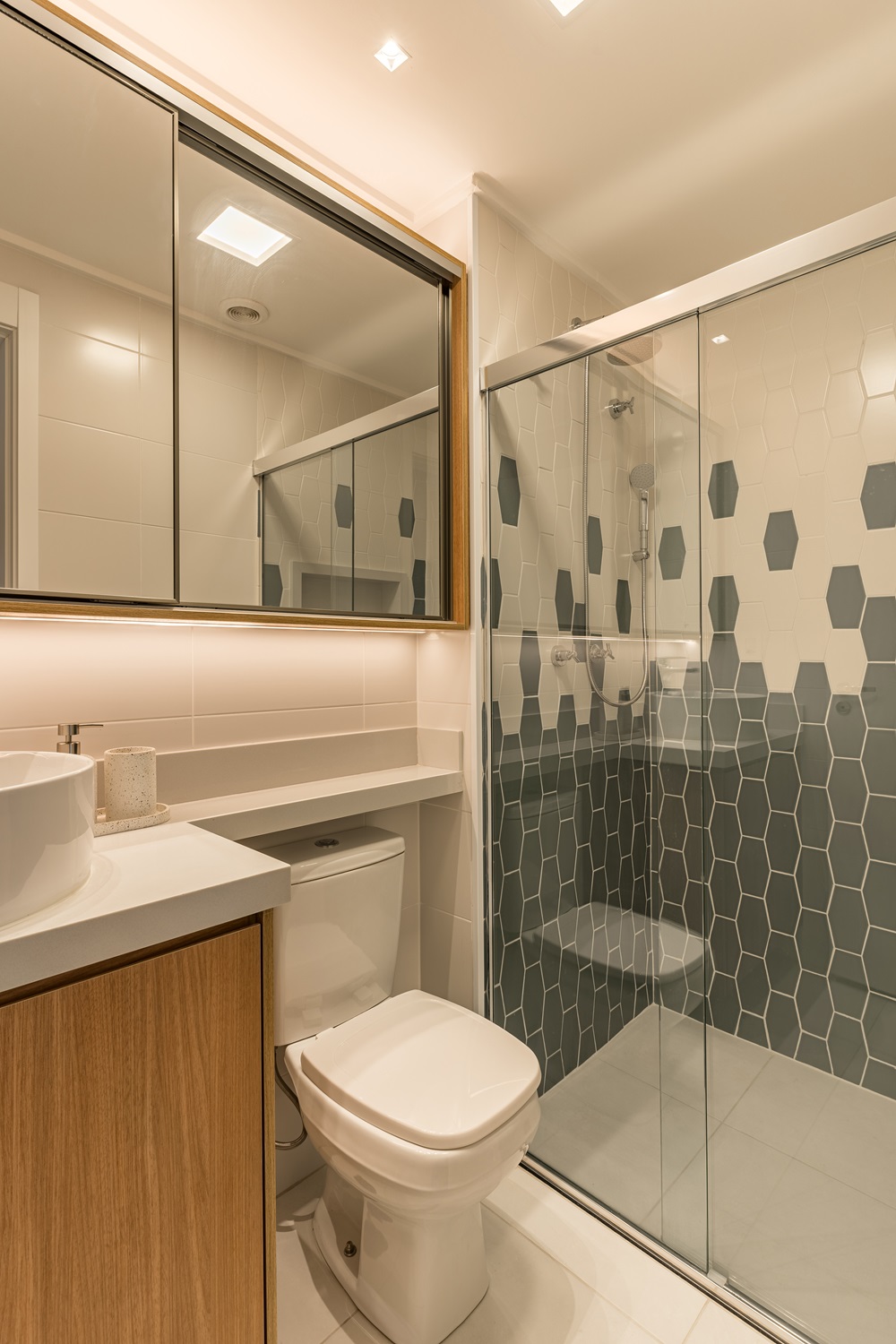 No banheiro, a marcenaria também brilha. Além do gabinete convencional da pia, foi criado um armário escondido atrás do espelho, oferecendo ainda mais espaço de armazenamento para produtos de beleza e higiene pessoal.