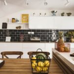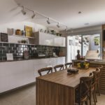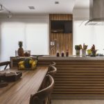 “Para que ficassem todos confortáveis, projetamos uma ilha central que mistura o granito preto São Gabriel escovado com madeira e, abriga banquetas, cervejeira e armários”, explica.