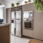 Ao lado da bancada da área molhada, onde fica a cuba, foi instalada, por opção do cliente, uma pratica churrasqueira a gás . A geladeira side by side foi renovada utilizando a técnica de adesiva-la de acordo com gosto dos clientes.