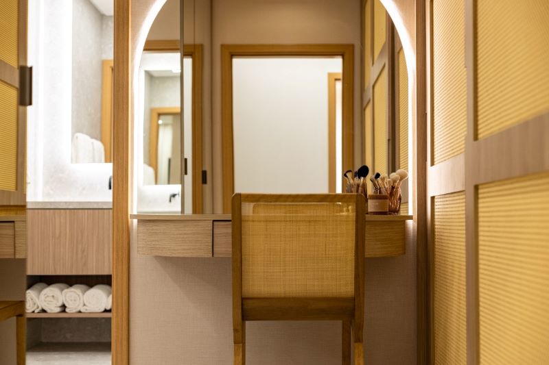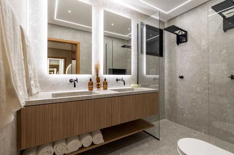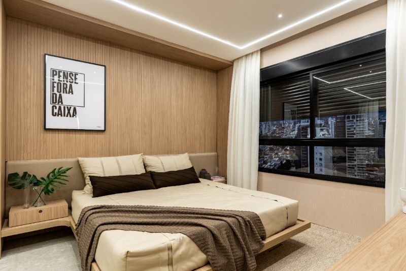 O arquiteto revela que a ideia principal do projeto foi trazer uma pegada mais minimalista com com cores acetinadas, que trazem um brilho intermediário entre o fosco e o semibrilho, e texturas marcantes nos papéis de parede. “Também trouxemos tons amadeirados, que foram inseridos para contrastar com os materiais mais frios e deixar o contexto mais aconchegante”, revela o profissional.