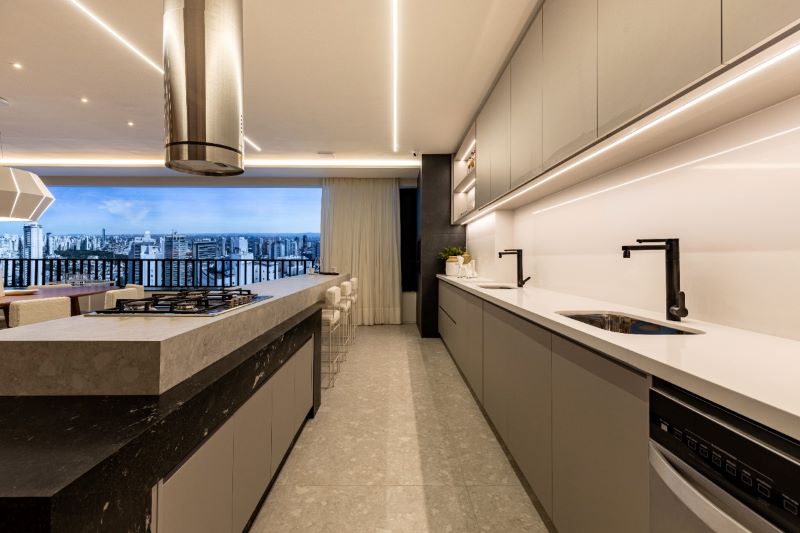 O arquiteto e urbanista complementa que a ideia, de forma geral foi trabalhar com linhas retas e escultóricas, como feito na cozinha. “Neste espaço, nós fizemos um balcão em formato de uma ilha, usando a técnica de estrutura em balanço. Isso foi um verdadeiro desafio estrutural, já que grande parte dela não possui apoio em um dos lados”, destaca.